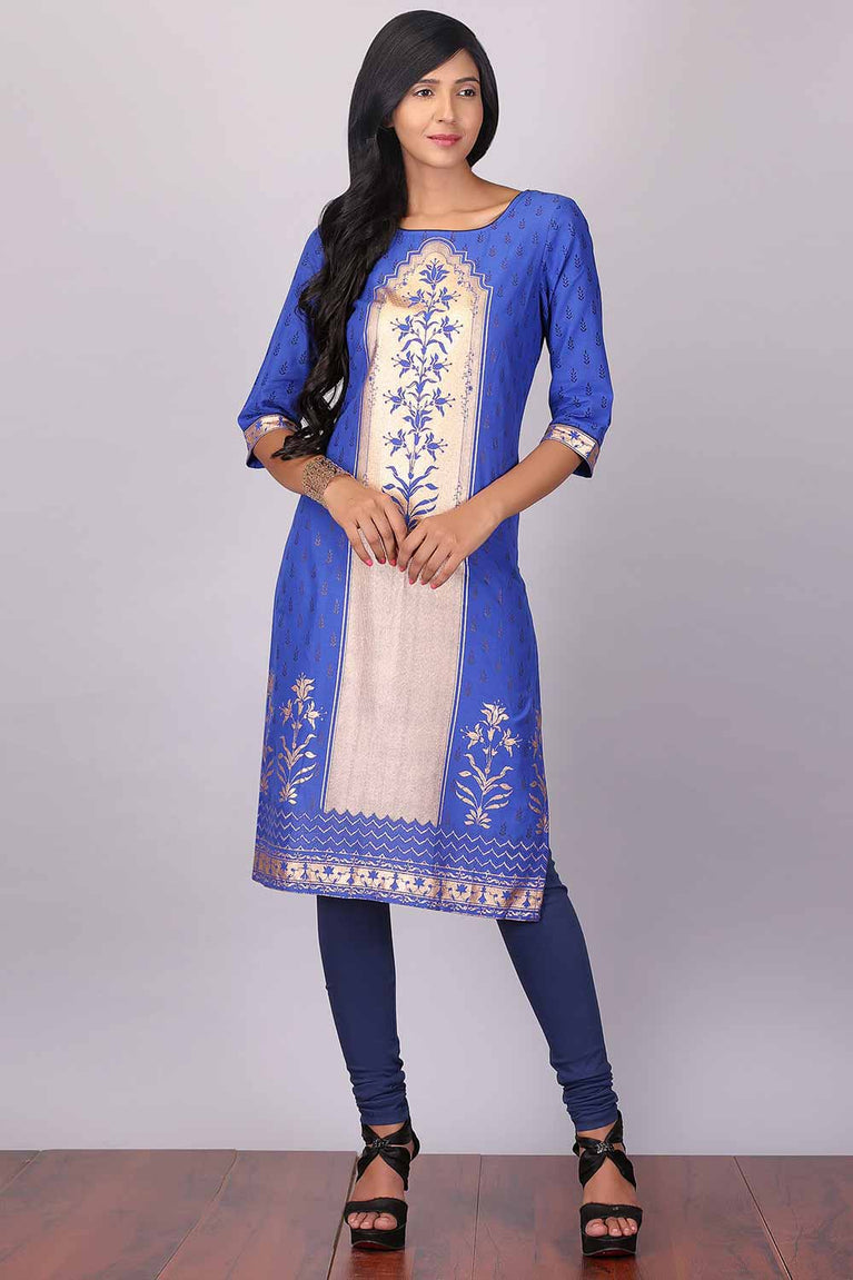 Aurelia presents a stunning blue fusion kurta that effortlessly blends traditional charm with contemporary style. This below-knee length kurta features a round neckline and three-quarter sleeves, perfect for casual occasions. Crafted using a woven construction technique, the kurta boasts a digital print and intricate zari detailing, adding a touch of elegance to the design. The a-line silhouette flatters various body types, while the viscose fabric ensures comfort and breathability. A thoughtful slit detail enhances both style and ease of movement. This versatile piece from aurelia's women's department is made from 100% viscose, making it ideal for everyday wear. The fusion ethnicity of this kurta allows for creative styling options, making it a must-have addition to any modern woman's wardrobe.
