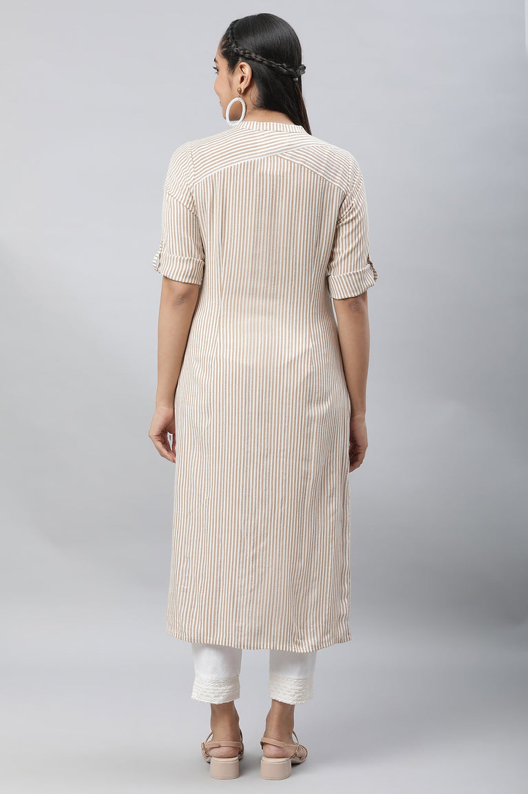 Get the stylish travel look in this stripe print short kurta in round neck and relaxed pintuck trouser pants.