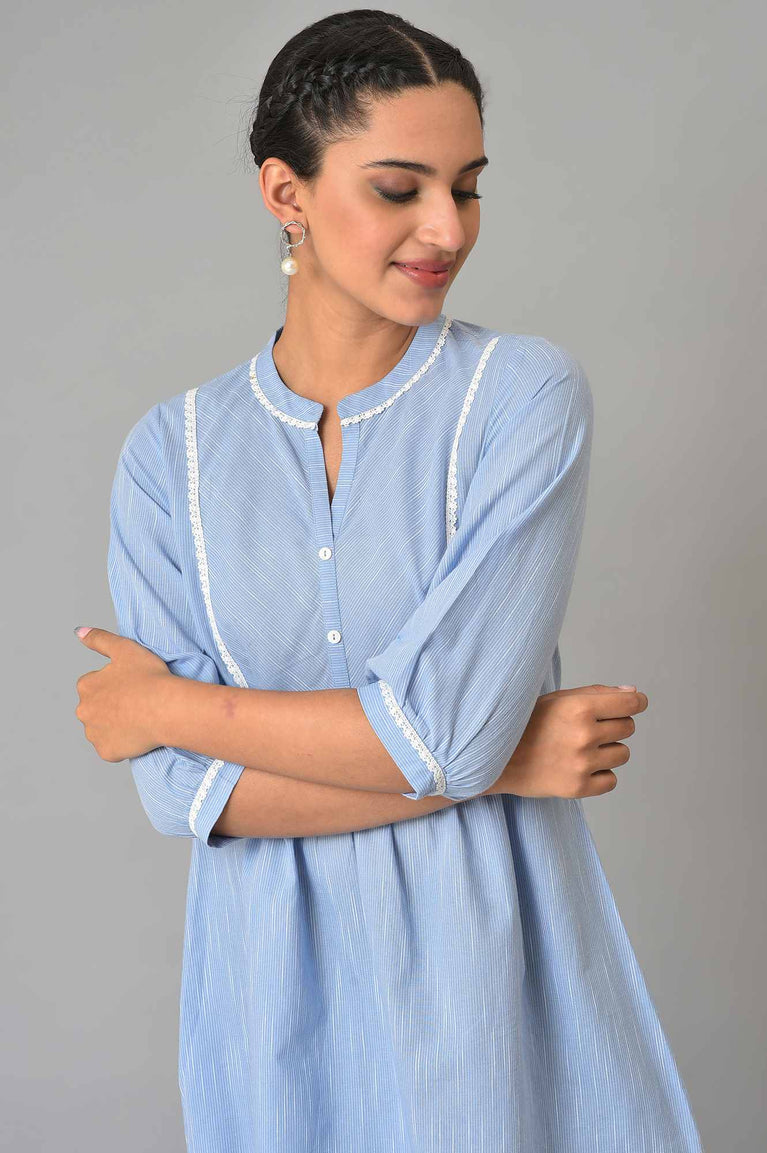 Get styled for a stylish and comfy travel look in this pretty blue striper kurta. The kurta has shirt collar and half button placket.