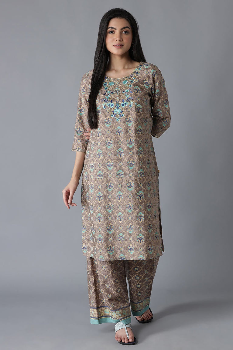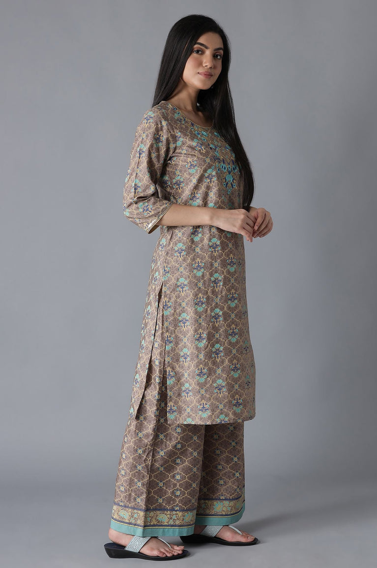 Festivities delve for contemporary attires with delightful hues, striking motifs and intricate detailing. This kurta set features a brown all-over mughal print kurta having zari embroidered yoke with round neckline and three-quarter sleeves. Well-matched with printed palazzos.