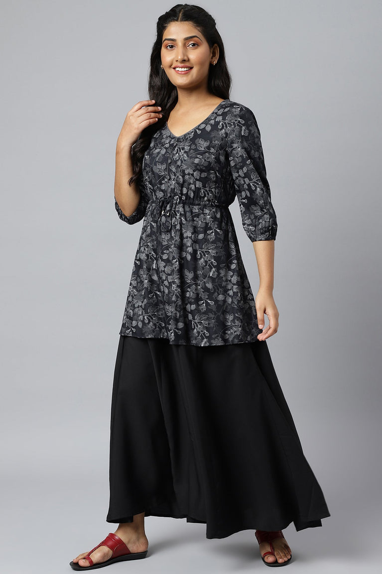 Black Floral Printed Textured Cotton Straight Kurta and Palazzo Set
