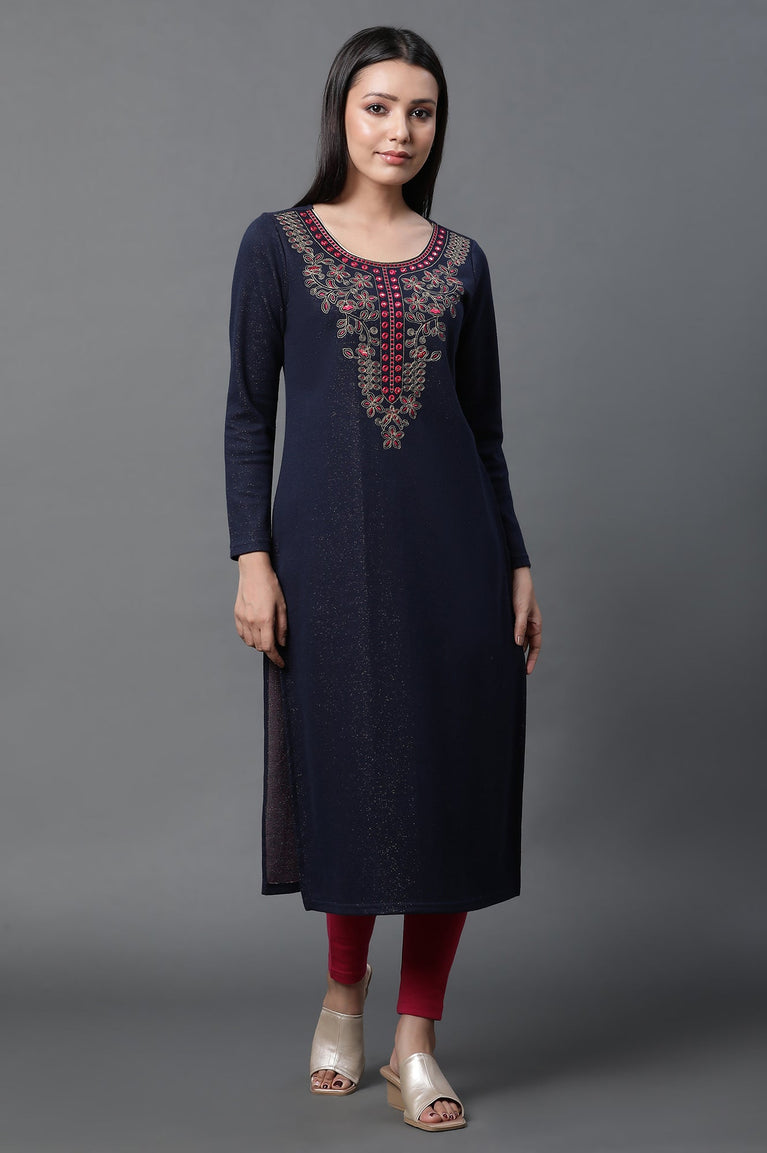 Blue Zari Embroidered Ethnic Winter Kurta