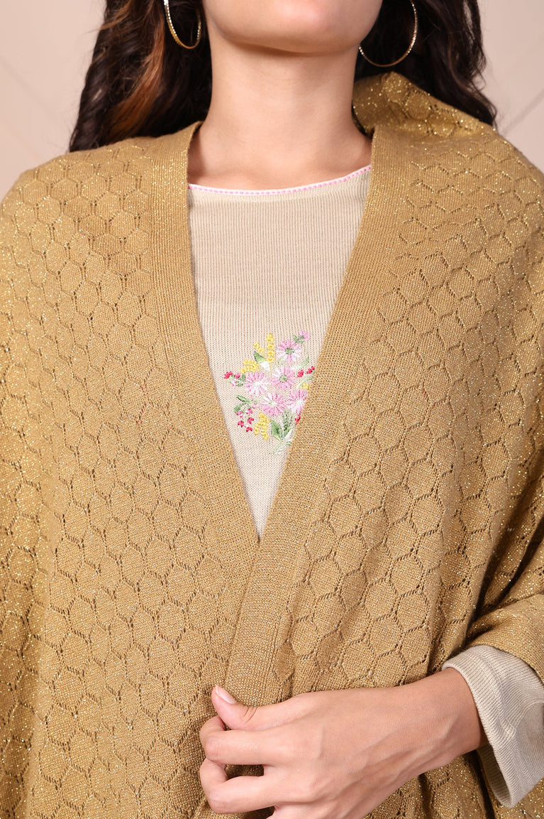 Golden hour elegance meets cozy sophistication in this textured beige shawl from Aurelia. Perfect for winter evenings, this designer shawl for women is crafted from 100% acrylic, offering a warm yet lightweight feel. The intricate textured weave adds depth, while the delicate fringes lend a playful touch. Measuring 1.8 meters in length and 27 inches in width, it drapes effortlessly over kurtas, dresses, or casual outfits. Whether you're attending a festive gathering or enjoying a casual outing, this ethnic shawl is your go-to accessory for a chic and cozy look.