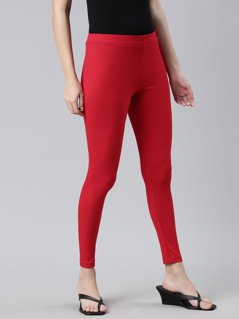 Go the ethnic way with our Solid Dark Red Ribbed Leggings. Made from Rayon & Spandex it has a elasticised waistband, slim fit & is of ankle length