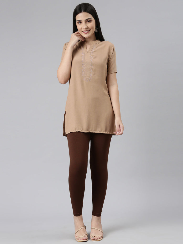 Go the ethnic way with our Solid Brown Cropped Leggings. Made from Cotton & Elastane, it has a elasticised waistband, slim fit & is of 7/8th length.