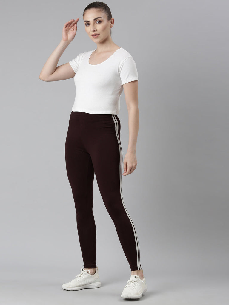 Brown Cotton Stretch Side Stripes Active Leggings