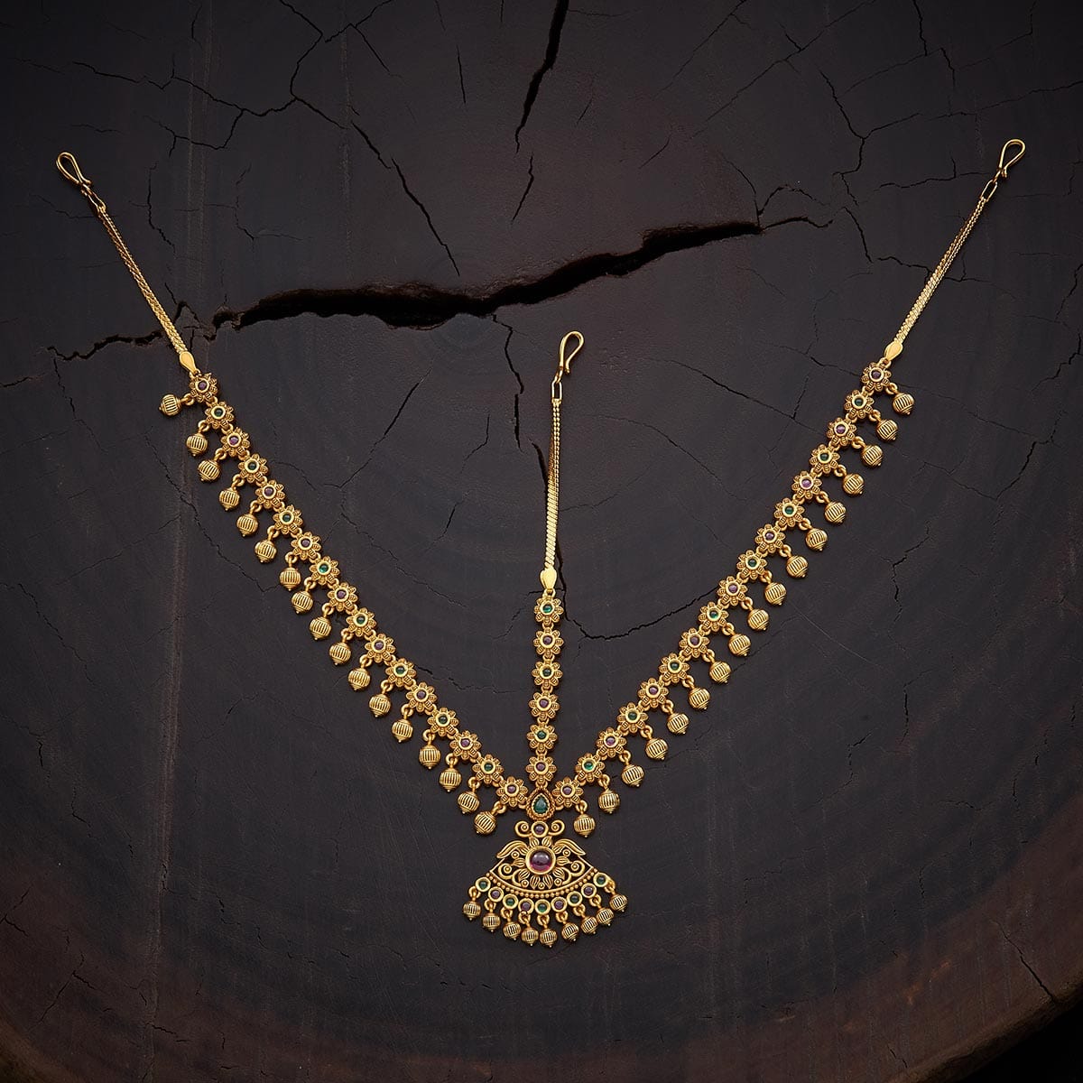 Maang tikka, made for the perfect bling, was developed for today's society. A maang tikka is perfect for every occasion and comes in various colors to suit your unique preferences. This maang tikka is constructed of ruby-green, green and ruby beads, and artificial stones, giving you a festive look. It has a floral motif with rubies incorporated in it.