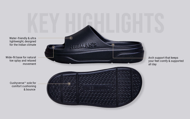 Introduce your feet to an ultimate wellness experience courtesy of the De-stress Slides. Slip into these after a demanding day at work or an intense workout session at the gym, to comfort your feet. Its soothing soft touch feel, cushioned support, and water-resistant build make these a suitable companion for the summer heat, beaming down, and the downpours of the upcoming monsoons.