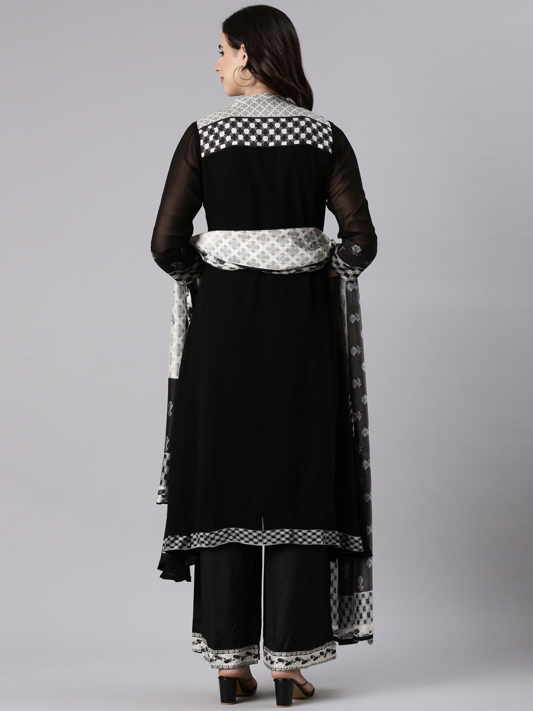 Elevate your wardrobe with this Black Georgette Printed Three Piece Set, featuring a graceful blend of comfort and style. The lightweight georgette fabric drapes beautifully, while the intricate prints add a refined touch. Perfect for formal events or elegant gatherings, this set offers a polished look with effortless charm.