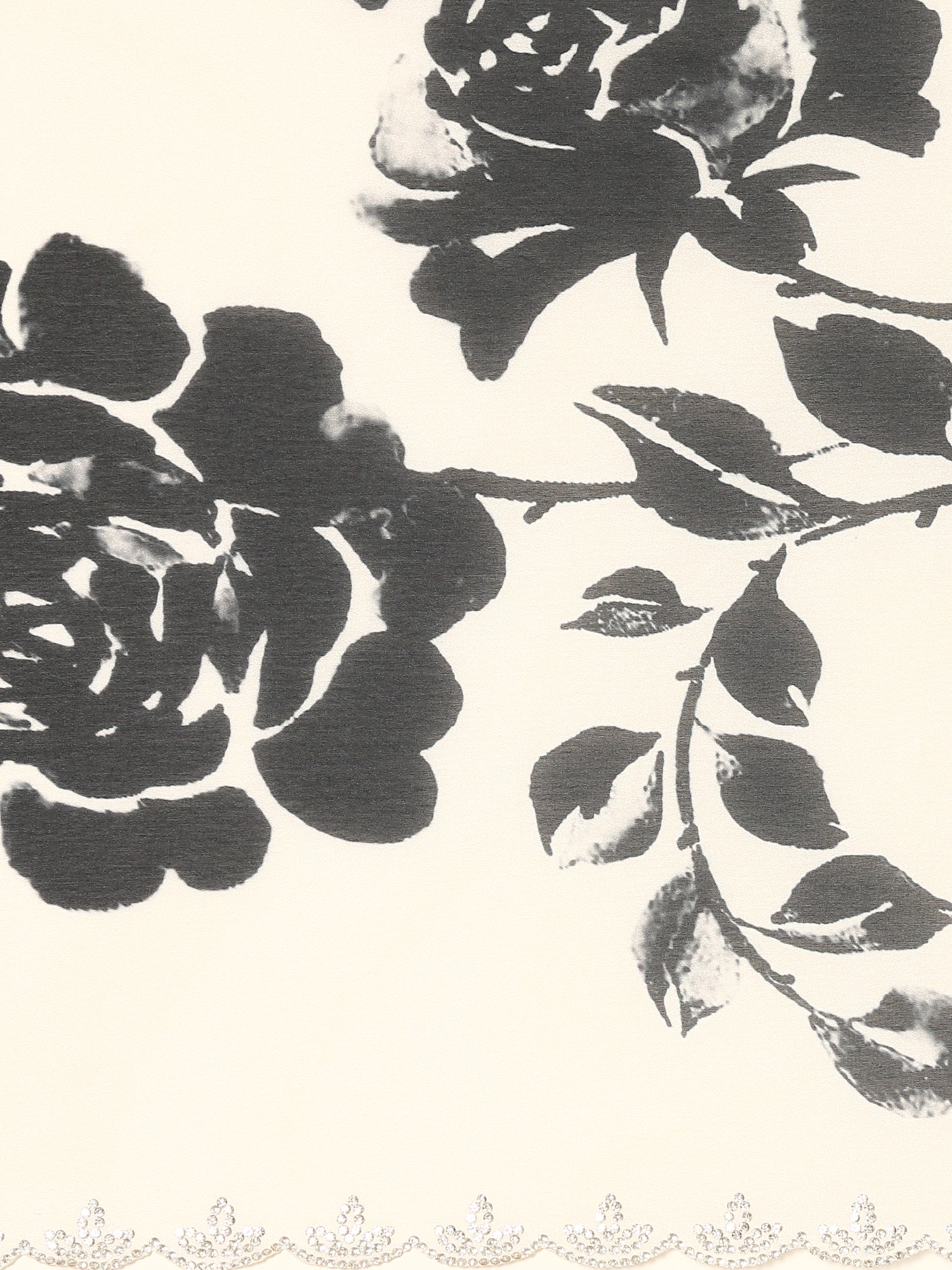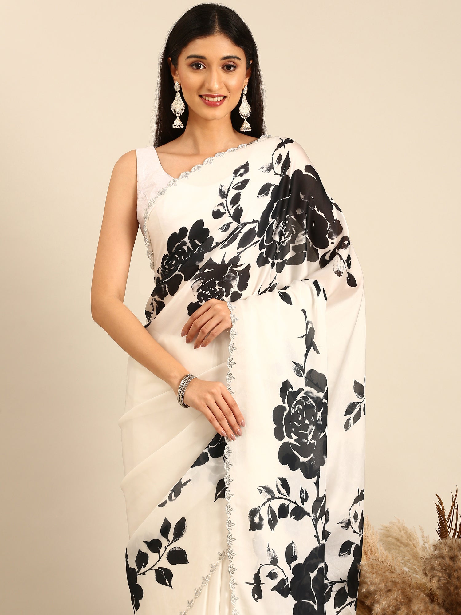This black and white floral printed satin saree combines elegance with a touch of sparkle through exquisite Swarovski embroidery. The smooth satin fabric ensures a graceful drape, while the delicate floral pattern adds timeless charm. Perfect for special occasions, this saree offers both comfort and style, making you feel confident and