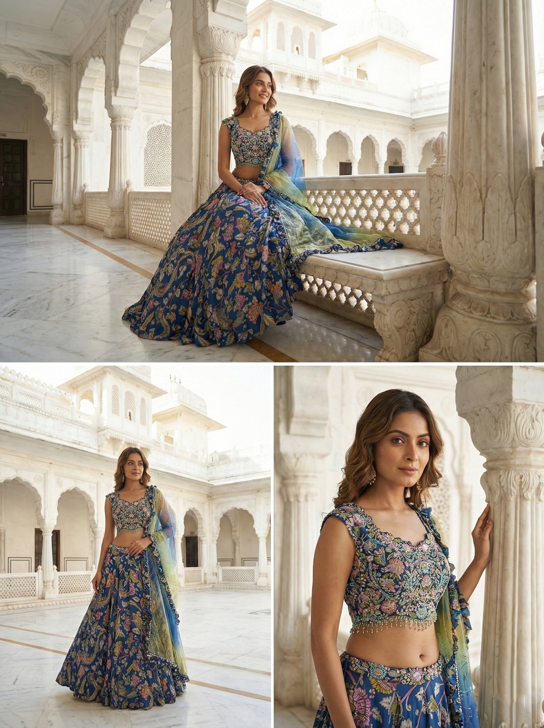 Embrace timeless elegance with this stunning blue georgette ghagra set, featuring an intricate floral digital print that captures traditional charm with contemporary flair. Crafted from lightweight, breathable georgette fabric, this ensemble drapes beautifully and offers exceptional comfort for extended wear. Perfect for weddings, festivals, and special celebrations, the set combines classic silhouettes with modern design sensibilities. The vibrant blue hue complements various skin tones, while the detailed floral motif adds visual interest and sophistication. Ideal for those seeking authentic ethnic wear that doesn't compromise on style or comfort.