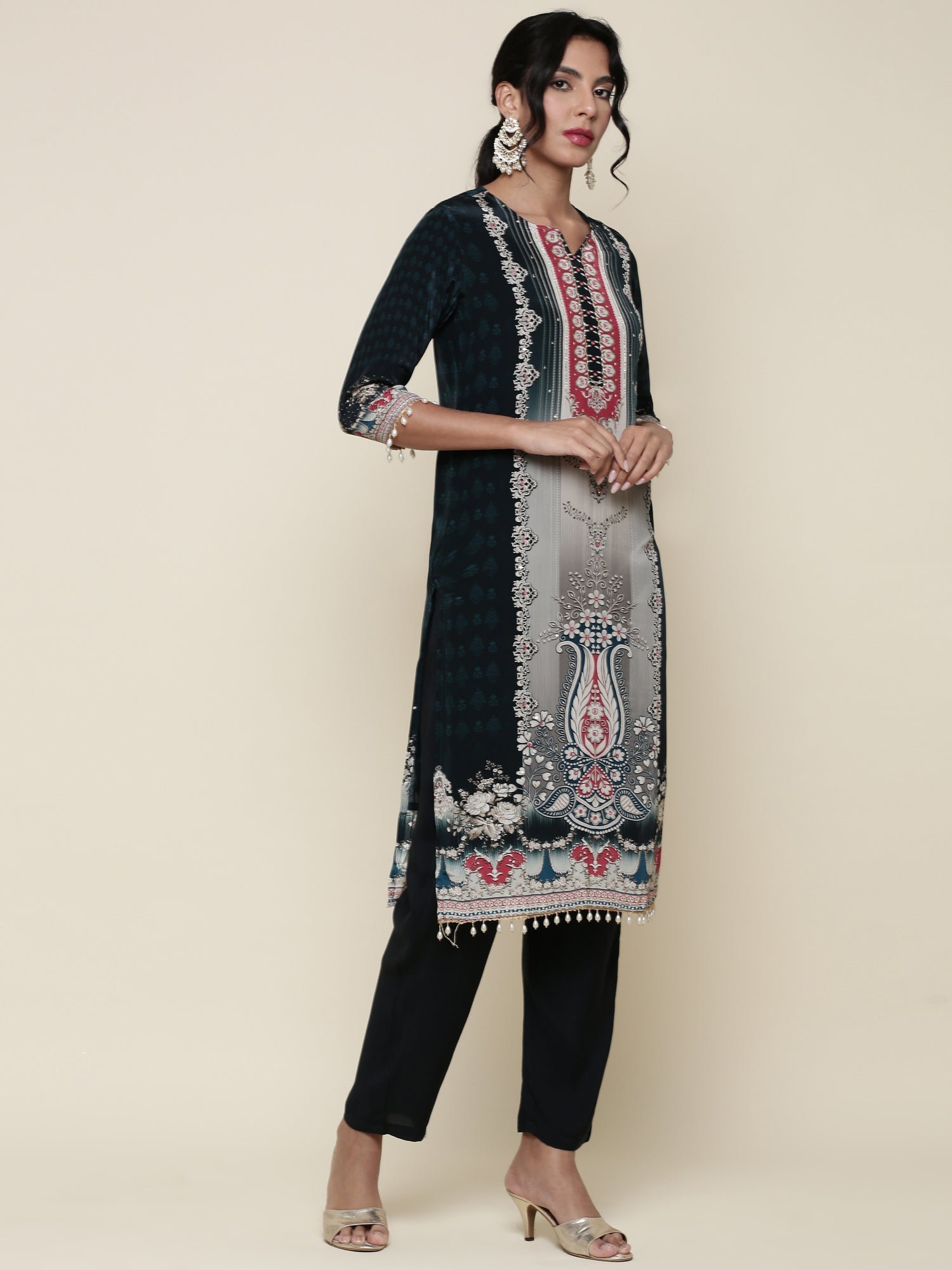 This Deep Green Crepe Three-Piece Suit Set features exquisite digital prints on premium crepe fabric, ensuring both elegance and comfort. The set includes a digitally printed kurta, matching bottom, and a coordinating dupatta, perfectly styled for formal and festive occasions.