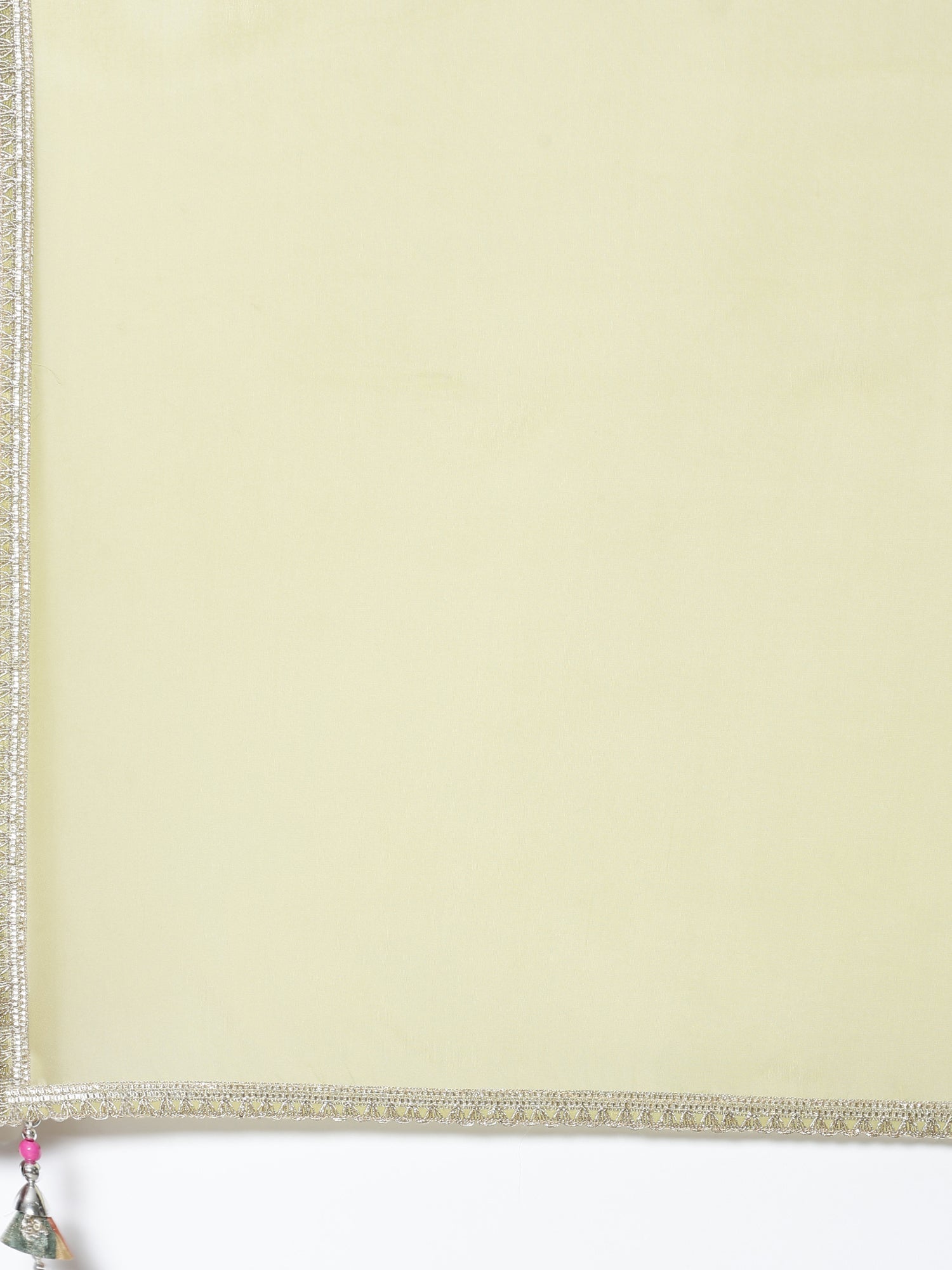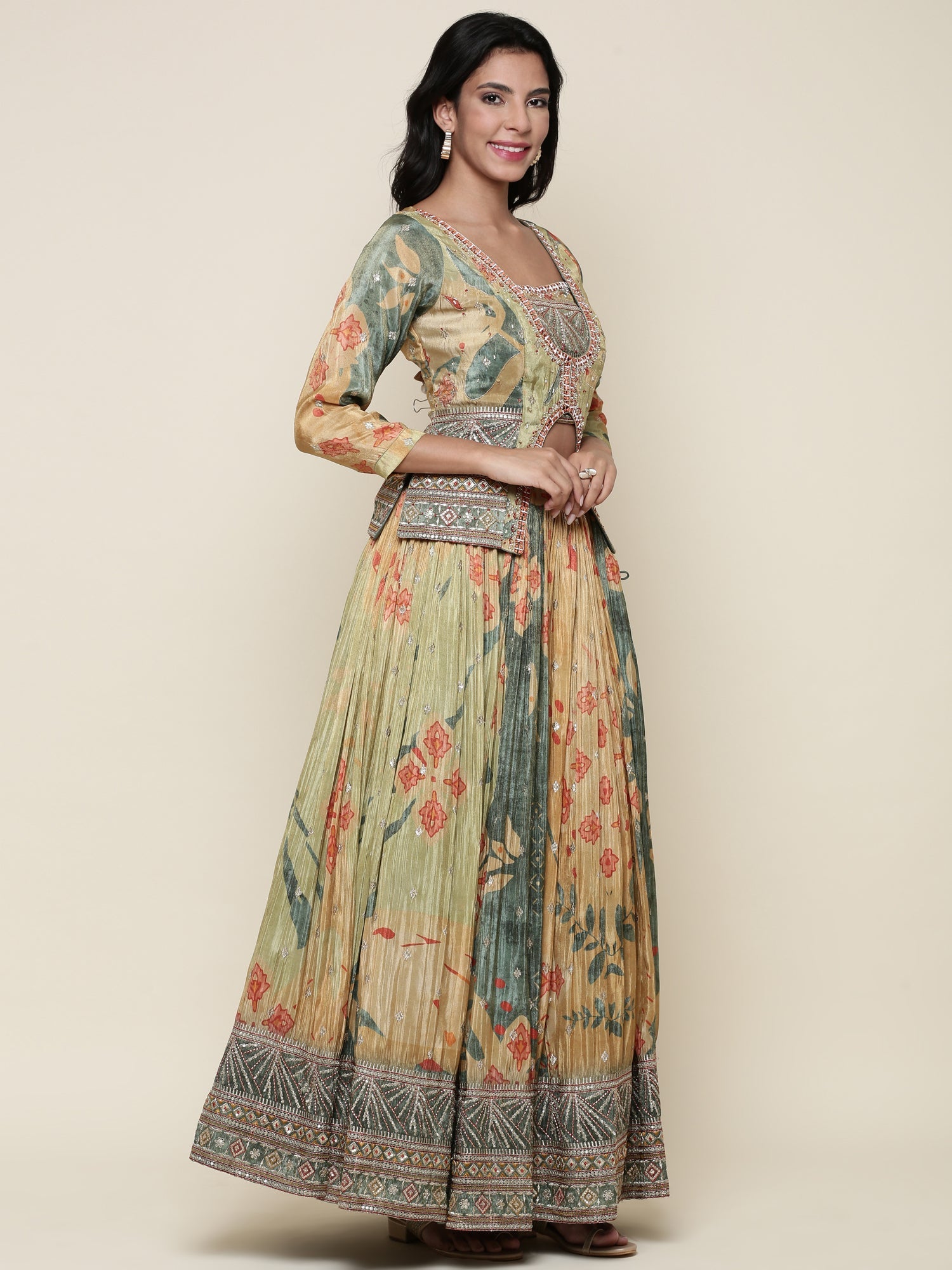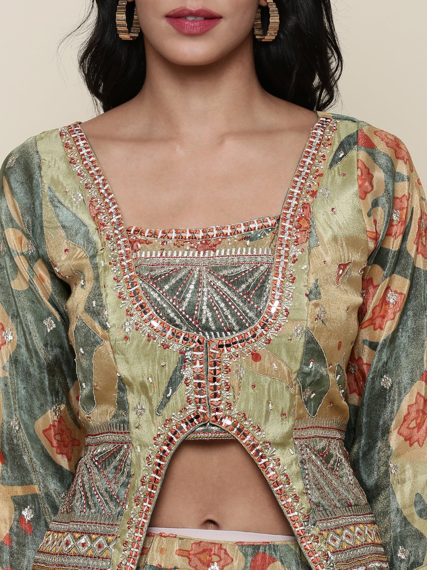 Elevate your festive wardrobe with this stunning green tissue embroidered two-piece ghagra set. The intricately embroidered jacket adds elegance and charm, perfectly complementing the flowing ghagra for a graceful silhouette. Lightweight and vibrant, this set ensures you stand out effortlessly at any celebration or special occasion. Experience the perfect blend of traditional craftsmanship and contemporary style in one exquisite ensemble.