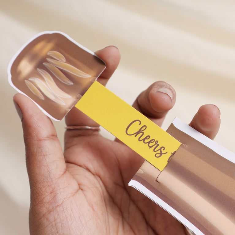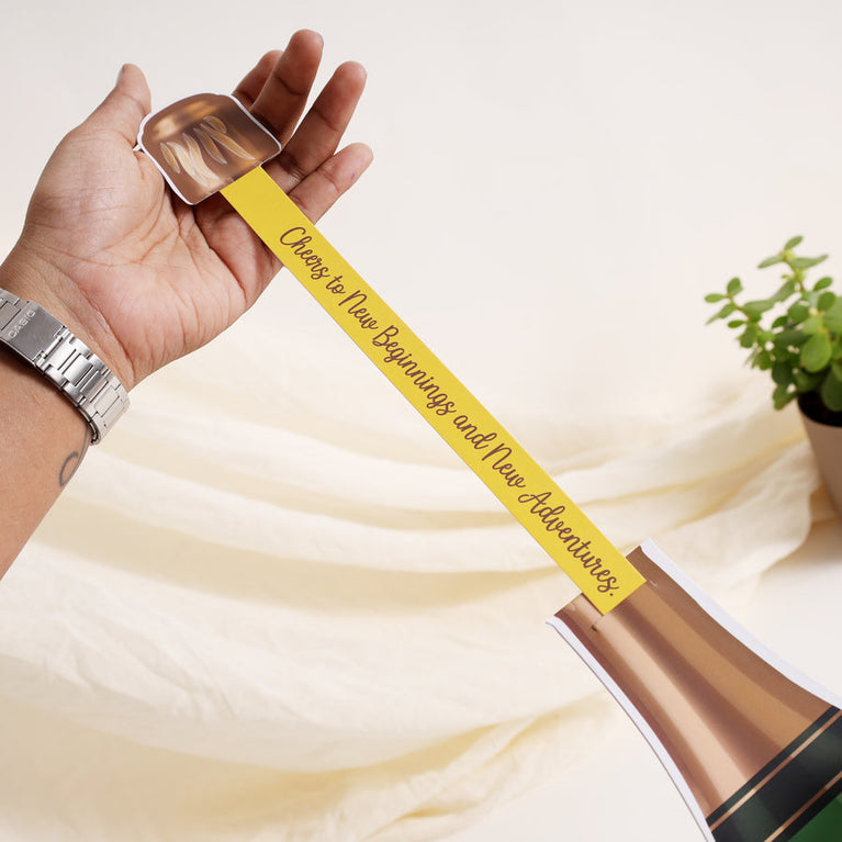 Here’s a New Year card that actually feels like a celebration. A champagne card that you can ‘pop’ and a tiny message inside that toasts fresh starts. This bubbly little card brings the joy of popping a champagne bottle on new year's minus the mess. A cute gift to share new year excitement with your loved ones. Specifications-Size : 29.5 x 8 cms
