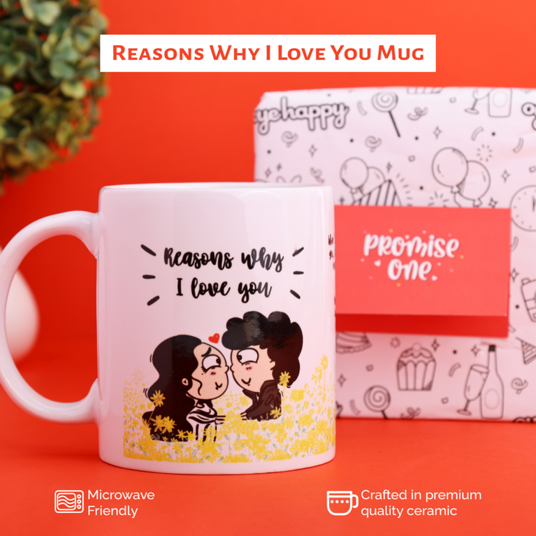 Reasons Why I Love You Mug: Surprise your special one with this romantic mug. A coffee mug with the most adorable illustrations telling your special one why you love him/her. This surprise is known to kill with its cuteness.