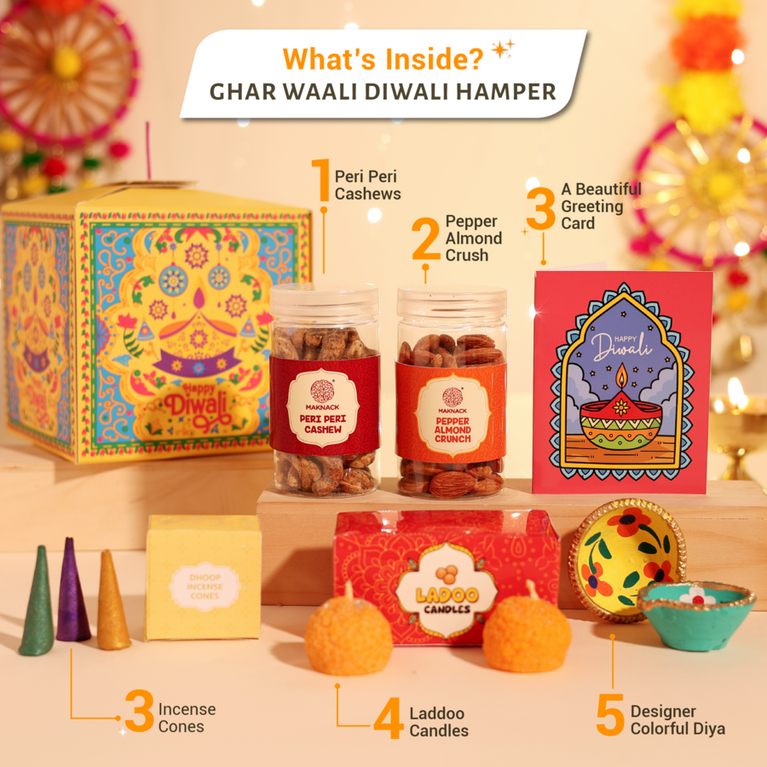 Introducing India’s First Patakha Box — a one-of-a-kind festive surprise that looks like a cracker but opens up as a magical hamper. It’s designed to give you the joy of lighting something special without any noise, or pollution.Celebrate Ghar Waali Diwali with a thoughtfully curated hamper that includes:Peri Peri CashewsPepper Almond CrunchLaddoo CandlesIncense ConesA beautiful Greeting CardDesigner Colorful DiyaHow It Works :The Patakha Box is simple and safe to use:Light the wick or pull it gently.Watch the box unfold in a magical way.Experience the joy of festive unboxing with none of the mess or worry.Specifications-Size of the box: 14 cm X 14 cm X 14 cm
