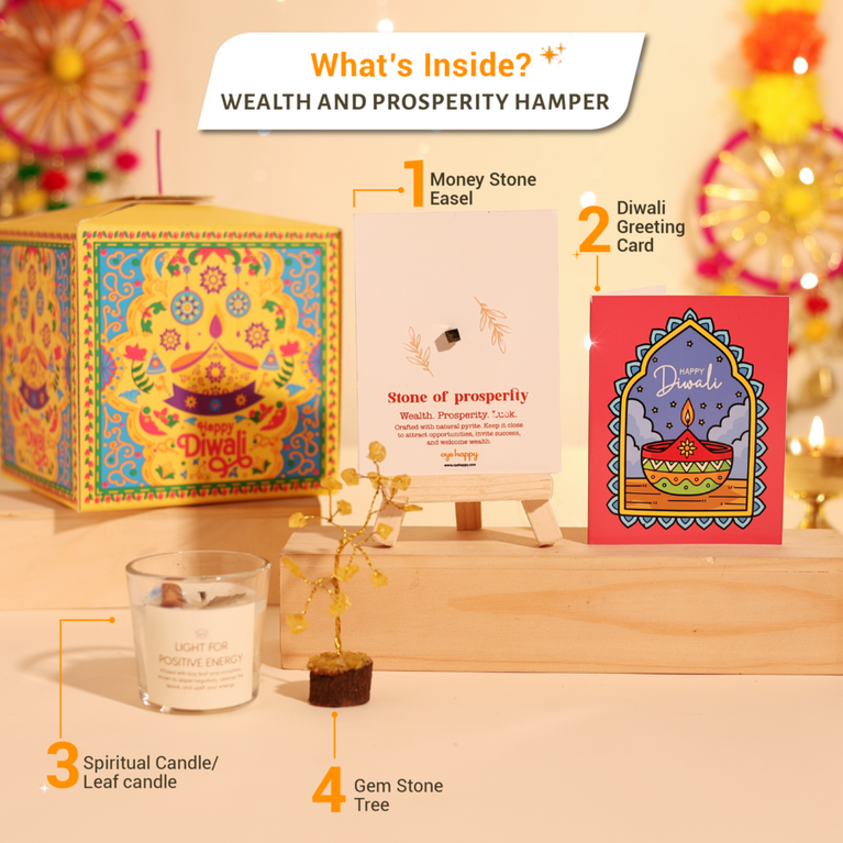Introducing India’s First Patakha Box — a one-of-a-kind festive surprise that looks like a cracker but opens up as a magical hamper. It’s designed to give you the joy of lighting something special without any noise, or pollution.Celebrate Diwali with a thoughtfully curated hamper that includes:Gem Stone Tree Money stone Easel Spiritual Candle/leaf candle Diwali Greeting cardHow It Works :The Patakha Box is simple and safe to use:Light the wick or pull it gently.Watch the box unfold in a magical way.Experience the joy of festive unboxing with none of the mess or worry.Specifications-Size of the box: 14 cm X 14 cm X 14 cm