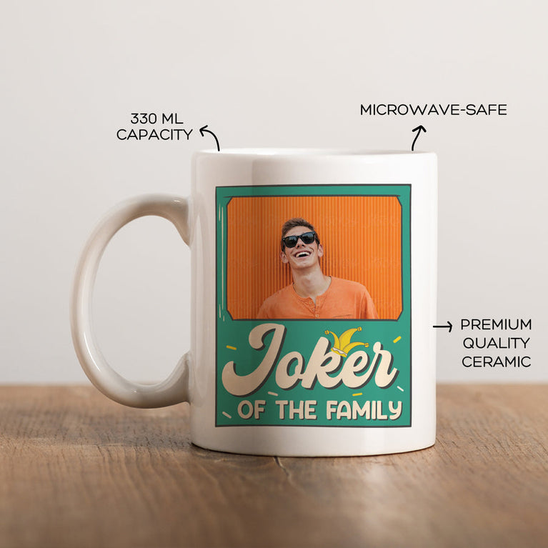 For the one who keeps everyone laughing, this Joker of the Family mug is a perfect fit! And the best part? You can add their photo to the mug to honor(or tease) your favorite joker.Specifications :Capacity of the Mug - 330mlContent on the Mug - Joker of the Family.