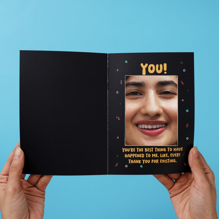 Inside of the card (which also has a mirror): You. You’re the best thing to have happened to me. Like, ever! Thank you for existing.