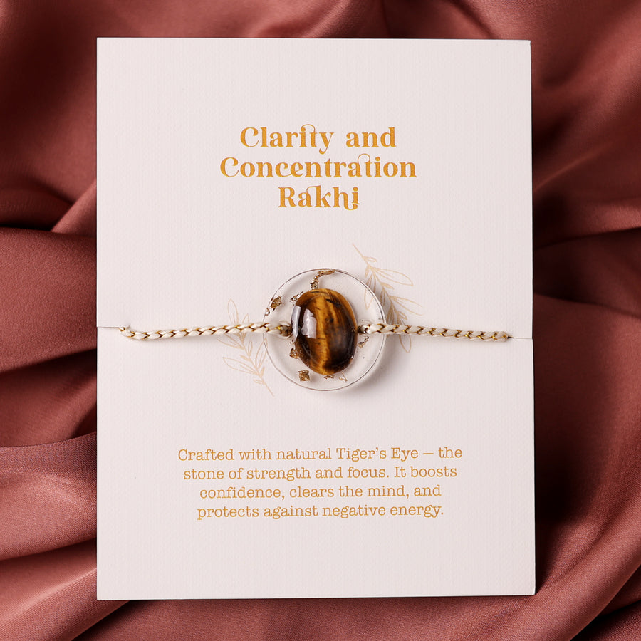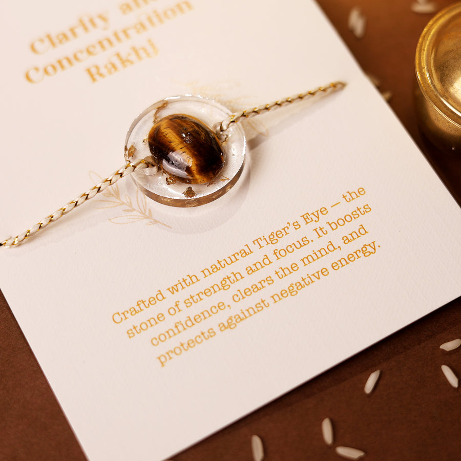 This Clarity and Concentration Rakhi is crafted with natural Tiger’s Eye, the stone of strength and focus. Known for boosting confidence, clearing the mind, and protecting against negative energy, this rakhi helps sharpen your brother's clarity and concentration.
