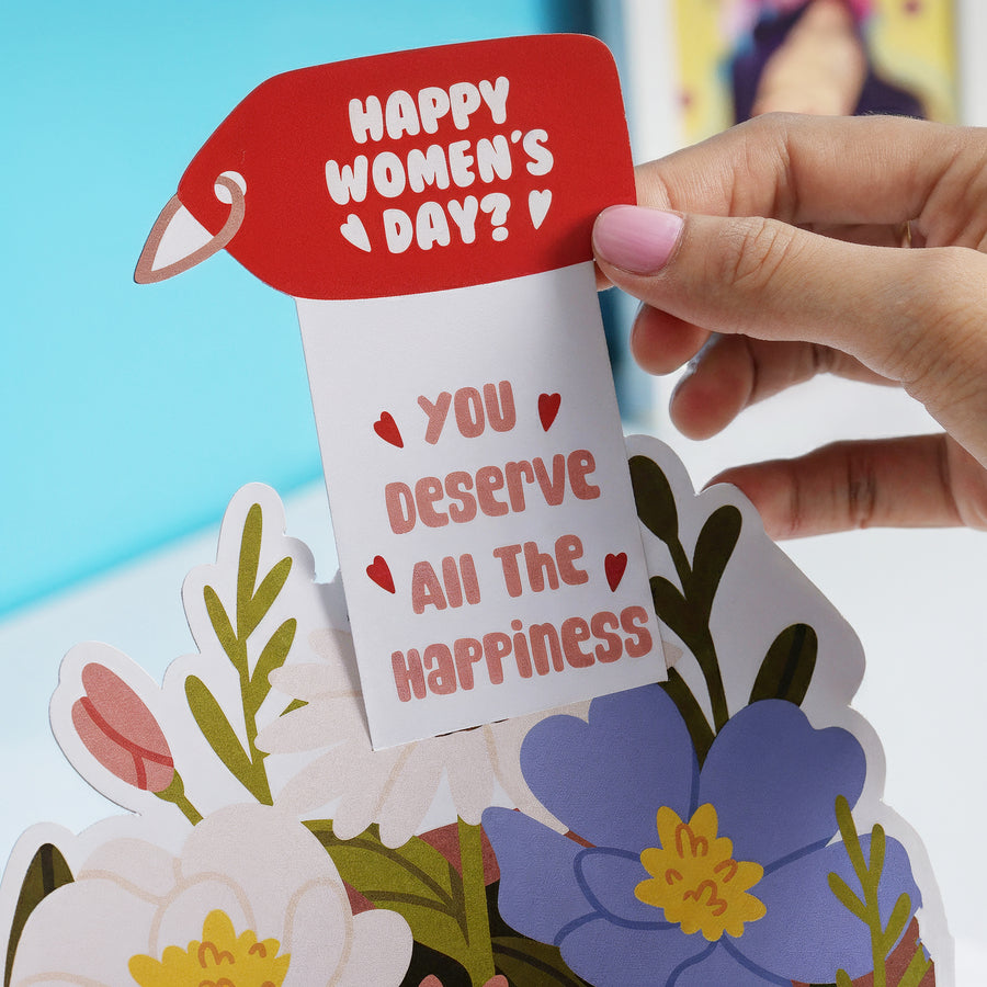 A card that comes with a cute little surprise! Simple on the outside, and opens up into something special. As it opens, a beautiful surprise and a cute message come to life. A lovely Women’s Day gesture to make her feel appreciated.