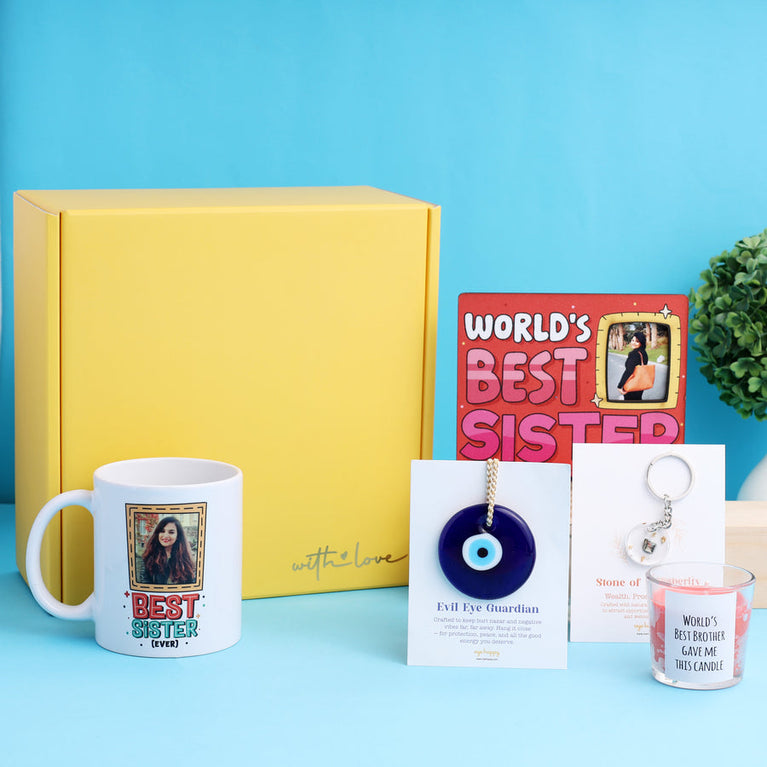 This Raksha Bandhan, make your sister’s day extra special with this thoughtfully curated hamper filled with unique and meaningful gifts. And you know the best part? As soon as your sister opens the hamper she will be greeted with lots of glitter that will deifinitely make her smile.The hamper includes -Best Sis Custom Table top - Give your sister a daily reminder of how amazing she is with this customizable tabletop photo frame.Evil Eye Charm – A timeless symbol of protection, this charm shields your sister from negative energy and harm, offering her a spiritual safeguard.Wealth Stone Keychain – Featuring a natural pyrite stone, this keychain brings luck and prosperity. A stylish way to wish your sister wealth and success wherever she goes.Candle - A candle that comes with a funny message to pull your sister's leg in the cutest way and make you the best brother ever.Best Sister Mug - Make your sister feel special this rakhi with Best Sister ever mug. Specifications: Size of the Table Top - 14.6 x 11.4 cmsCapacity of the Mug - 330ml
