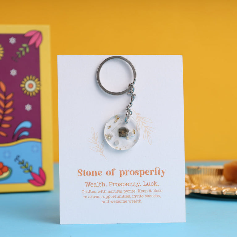 This Wealth and Prosperity Rakhi is crafted with natural pyrite, the stone of luck and abundance. Known for attracting opportunities and inviting wealth into your life, this rakhi brings prosperity to those who wear it.The pyrite stone is authentic and certified by the Gemological Institute (certificate not included with the Rakhi).Tie this rakhi to your brother and bless him with the energy of wealth, success, and endless possibilities this Raksha Bandhan.Size: 3 x 3 cm