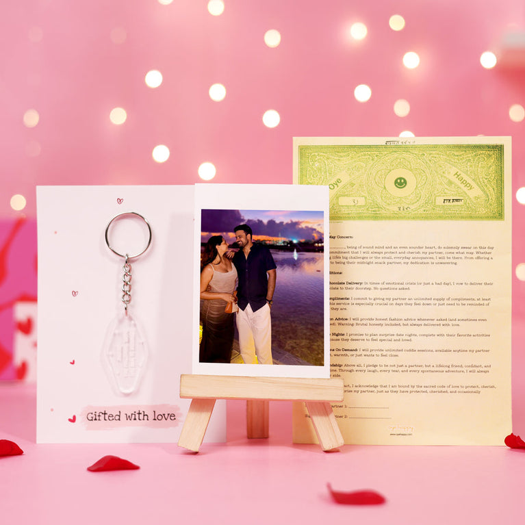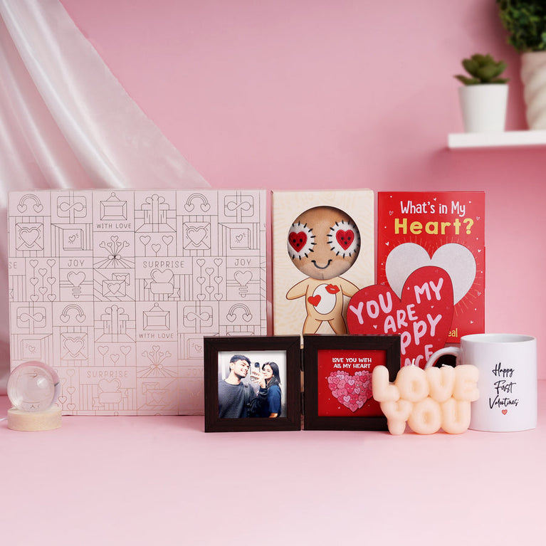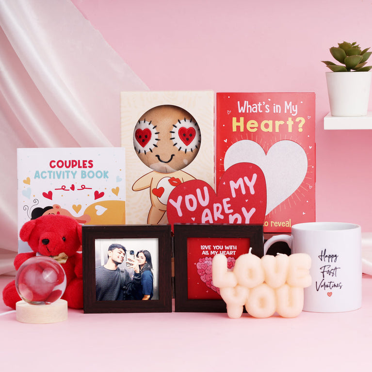 Your first Valentine’s Day with your partner is very special. It’s awkward excitement, constant smiling, and that feeling of doing something special for the very first time. This hamper is made for couples stepping into their first Valentine together - to laugh, connect, and make memories that actually feel like yours.The hamper includes: Boodoo Doll - A Boodoo(not Voodoo, but like Voodoo) Doll keeps things fun and light. It’s silly, playful, and perfect for teasing each other a little. A reminder that love can be full of laughs, not just romance.Burning Card - A Card to bring in the drama in the sweetest way. Surprise your Valentine's with this intense gift - you just need to add a little flame to the heart and watch it burn to reveal a hidden message.Couple Activity Book - This surprise is all about spending time together. From fun memories to cute moments, it gives you reasons to sit close, talk more, and discover new sides of each other without trying too hard.Happy First Valentine Mug - A Mug that makes the day feel official. Something simple that turns into a daily reminder of your very first Valentine moments.Heart Globe Lamp - Heart Globe Lamp quietly sets the mood. Turn it on and the room just feels nicer, softer, and more special. It’s calm, comforting, and perfect for those quiet Valentine moments together.Red Teddy - A cute gift for your partner that they would hold onto, keep nearby, and think of you when you’re apart.I Love You Candle - Set the first valentine's mood right with this cozy candle. It’s perfect for those slow Valentine moments you don’t want to rush.Mini Window frame - A surrise that holds a memory that belongs only to you two. Customise it with your 1 favourite picture and turn a moment into something you can look at every day and feel happy about.You Are My Happy Place Tabletop - This gift brings all your feelings together. Heart-shaped and full of meaning, it’s like a gentle reminder that being with them feels like home.Specifications:Size of the Burning Card - 13 cm x 18 cmSize of the Boodoo Doll Box - 20 x 11 x 6 cmSize of the Couple Activity Book - 13.5 x 19 cmsSize of the Tabletop - 5.5 x 6 inches