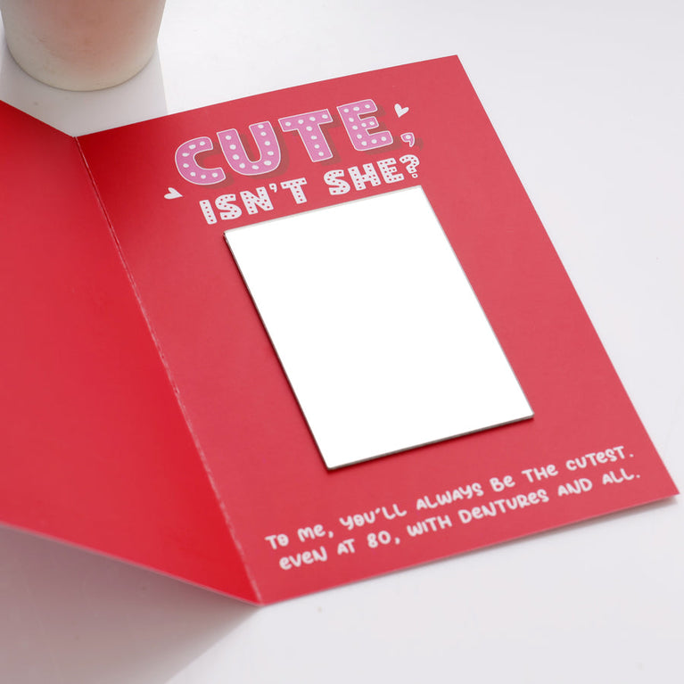 Looking for a fun, unforgettable way to express your excitement about your future together? Whether you’re planning a proposal, celebrating an engagement, or simply making your fiancée smile, the Future Wife Mirror Combo is a playful yet heartfelt gift she’ll cherish.This charming combo pairs a cute everyday mug with a witty mirror card, creating the perfect balance of romance, humor, and emotional connection.The MessageFuture Wife MugPrinted with the bold and loving message:“MEET MY FUTURE WIFE”This ceramic mug turns her daily coffee or tea break into a sweet reminder of what’s coming next—your life together.Future Wife Mirror CardThe card delivers a playful surprise with a loving twist:Front: “MEET MY FUTURE WIFE”Inside: A mirror reveals her reflection along with the adorable line:“CUTE, ISN’T SHE?”Followed by a heartfelt promise filled with humor and warmth:“To me, you’ll always be the cutest. Even at 80, with dentures and all.”Together, the mug and card create a moment that’s fun, emotional, and unforgettable.Specifications-Future Wife MugProduct Type: Ceramic MugCapacity: 330 mlPrint: High-quality, long-lasting printFuture Wife Mirror CardSize: 25.4 × 17.8 cmIncludes an attached mirrorElegantly packed in an envelopePackaging - Both items are securely packaged to ensure safe delivery, making the combo completely gift-ready right out of the box.Note: This is a pre-designed combo and cannot be customized.