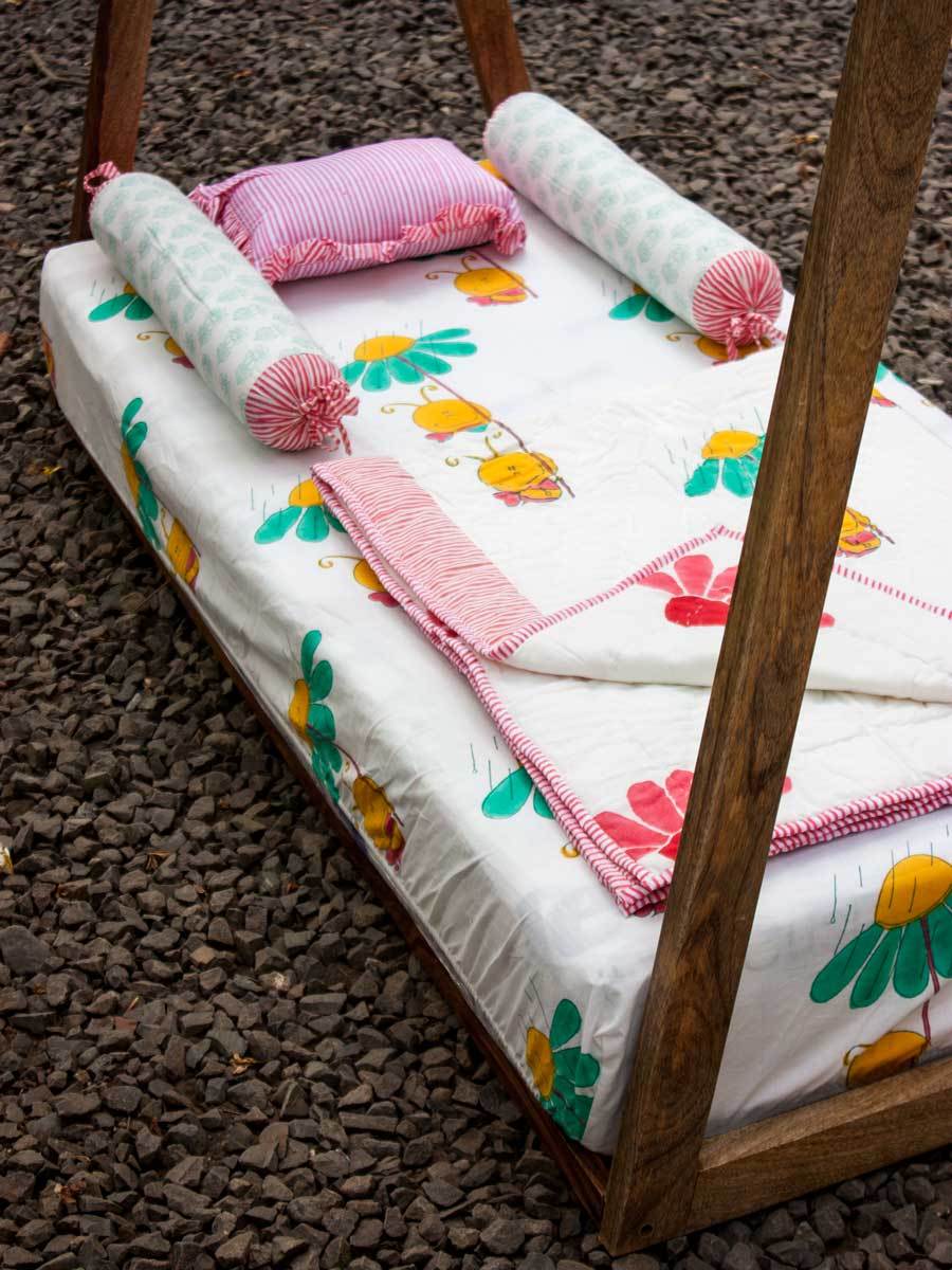 Presenting playful crib/cot hand block print GOTS certified organic cotton fitted sheets. The sheet contains elastic on the sides for easy operation and a snug fit. Made to fit all standard sizes of cots and cribs.