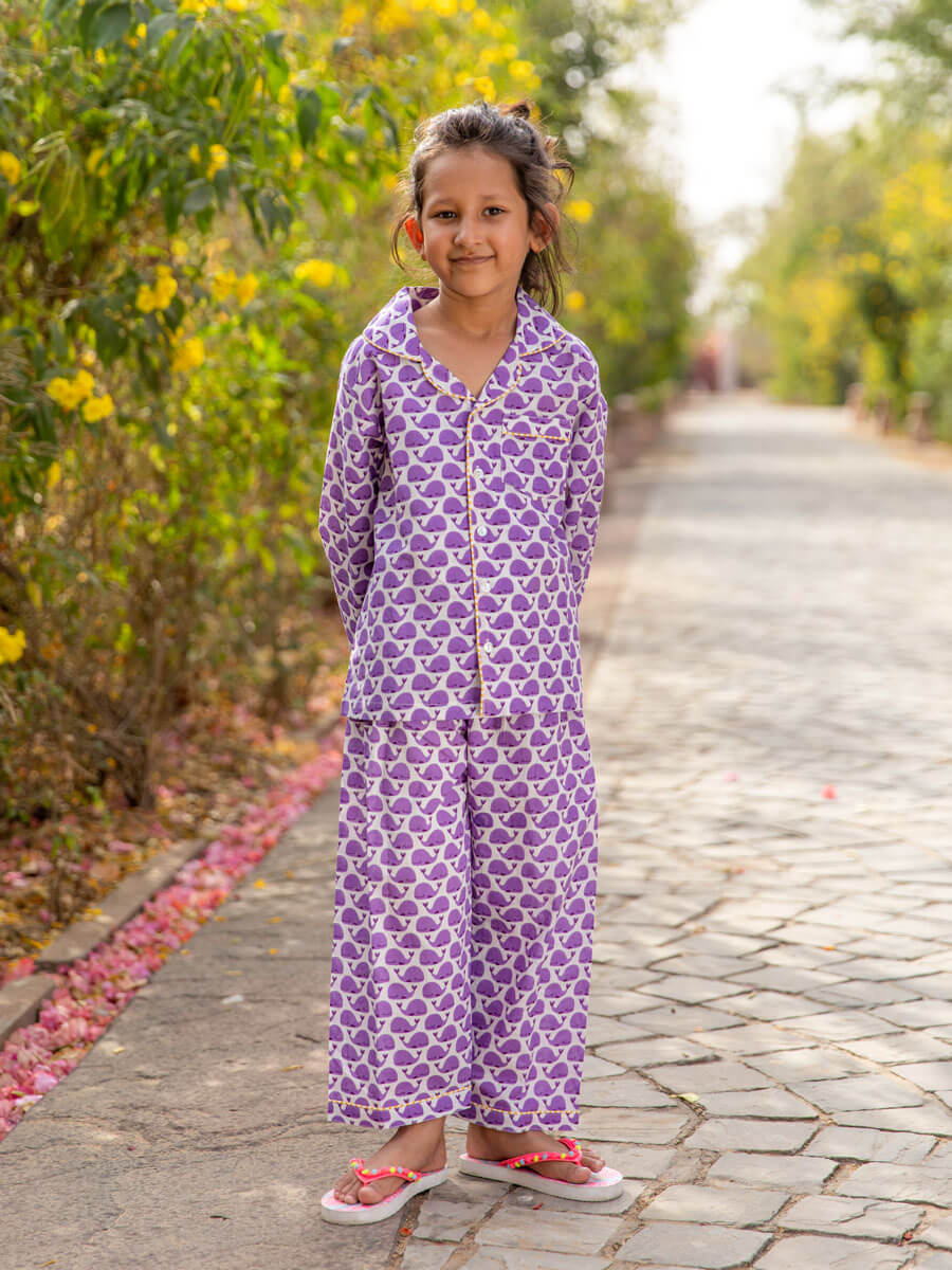 Purple Whale Block Printed Cotton Pyjama Set