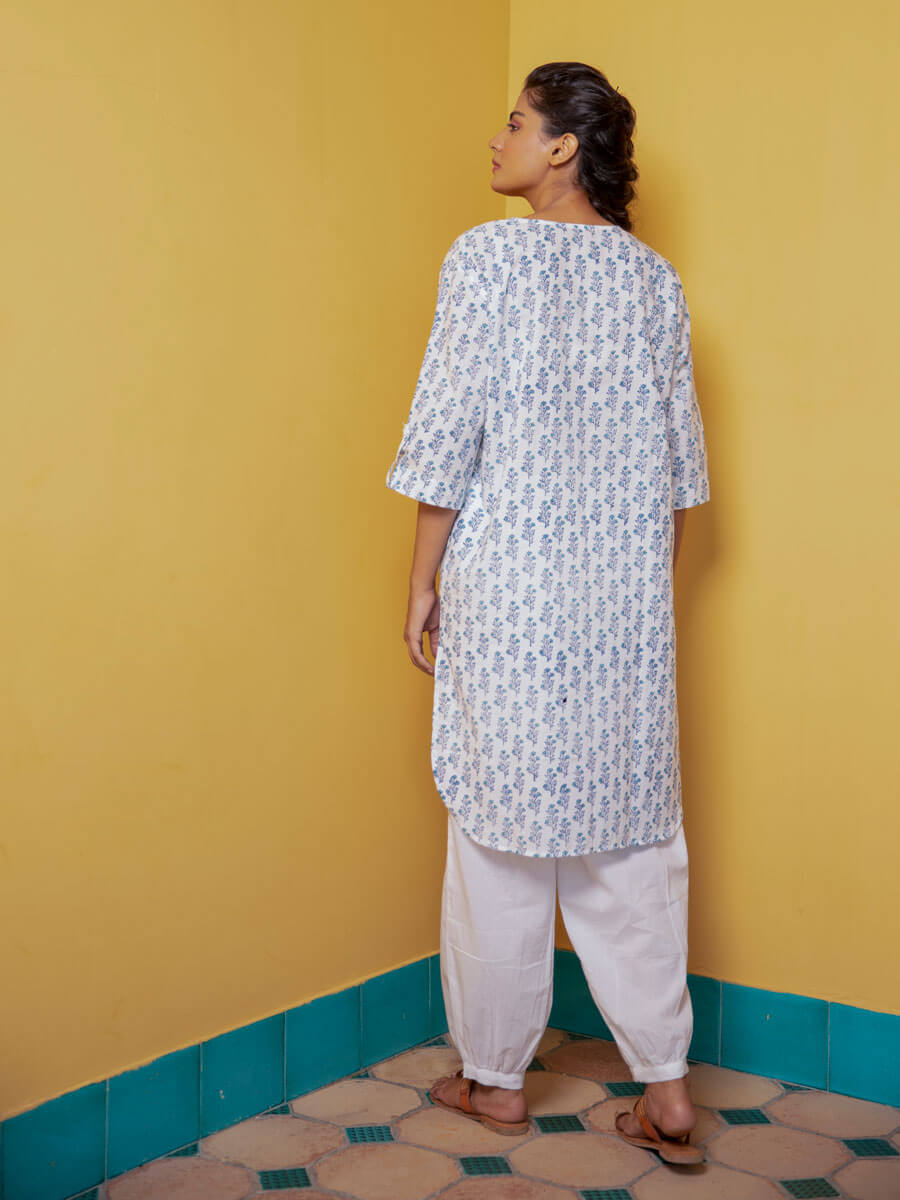 This lovely comfort-fit kurta and lantern pants set is perfect to wear at home, an easy stroll, coffee date, or casual brunch. The model is wearing an S size without any alterations.