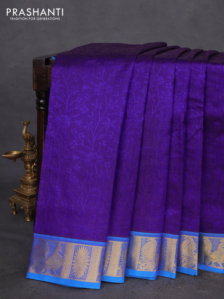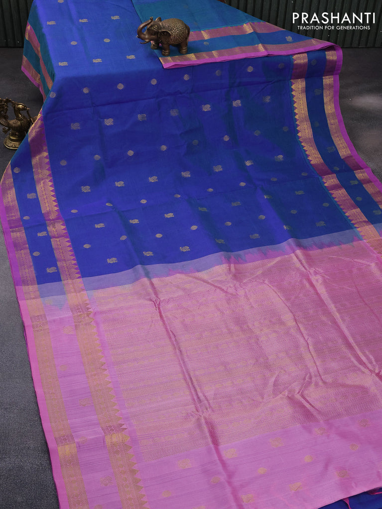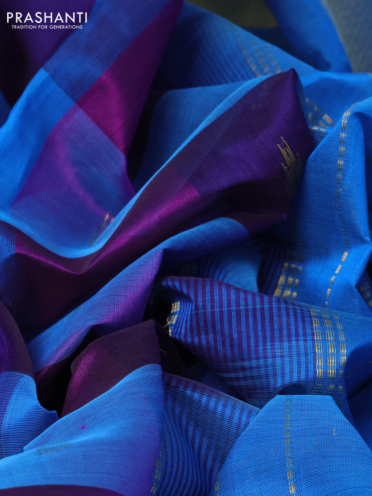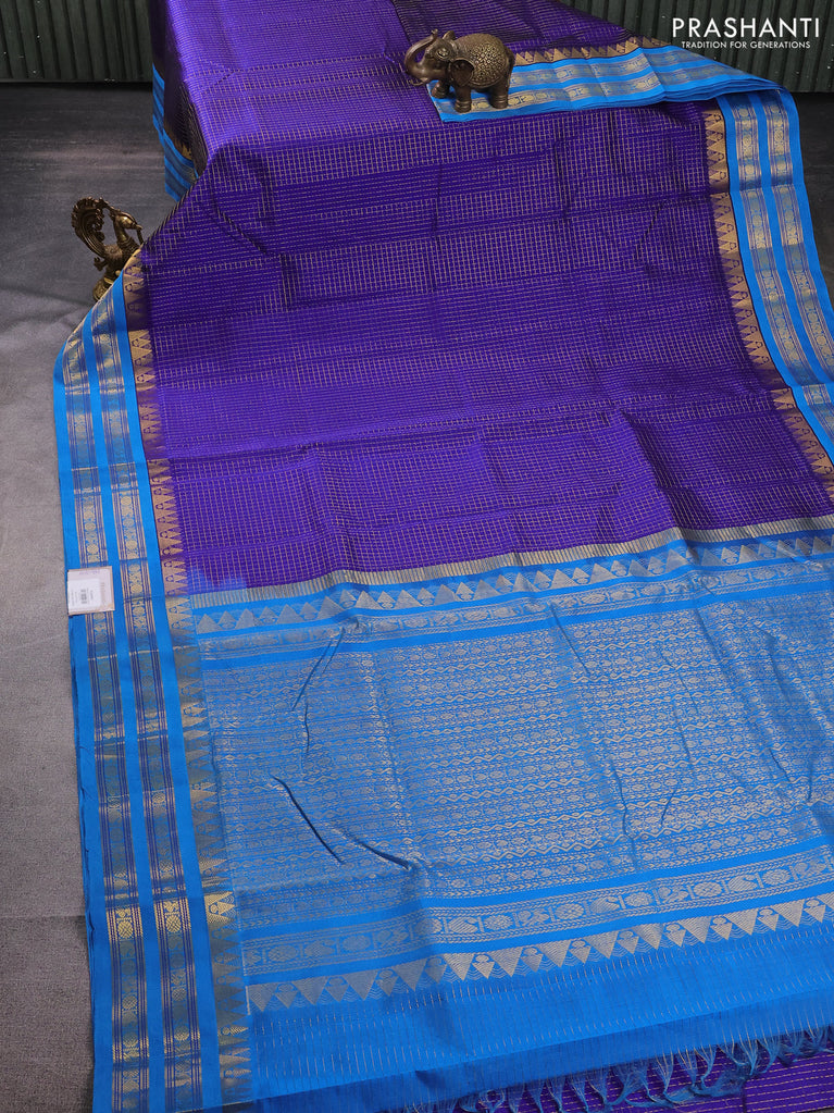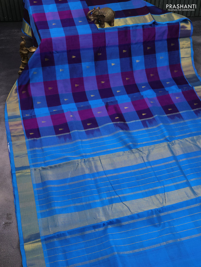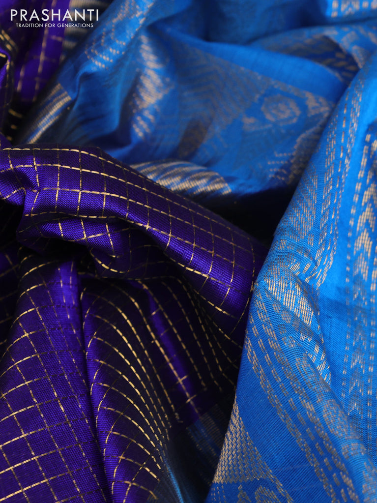 10 yards silk cotton saree deep purple and cs blue with allover paalum pazhamum checks & buttas and zari woven border