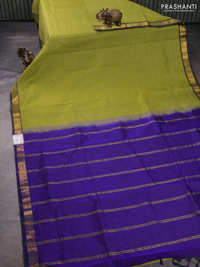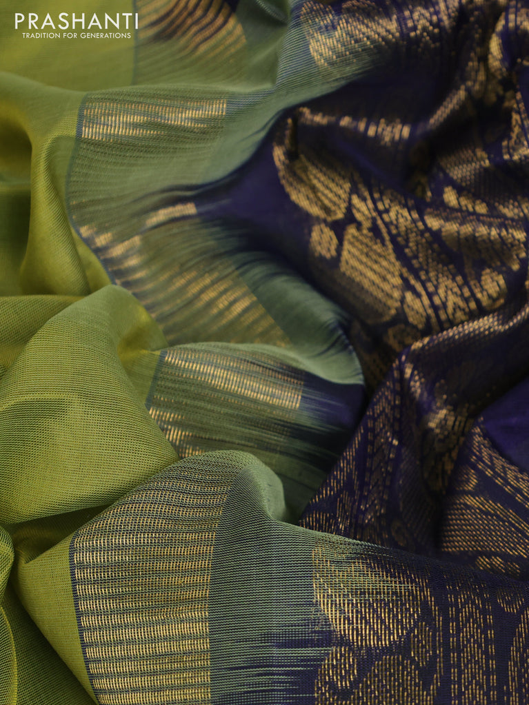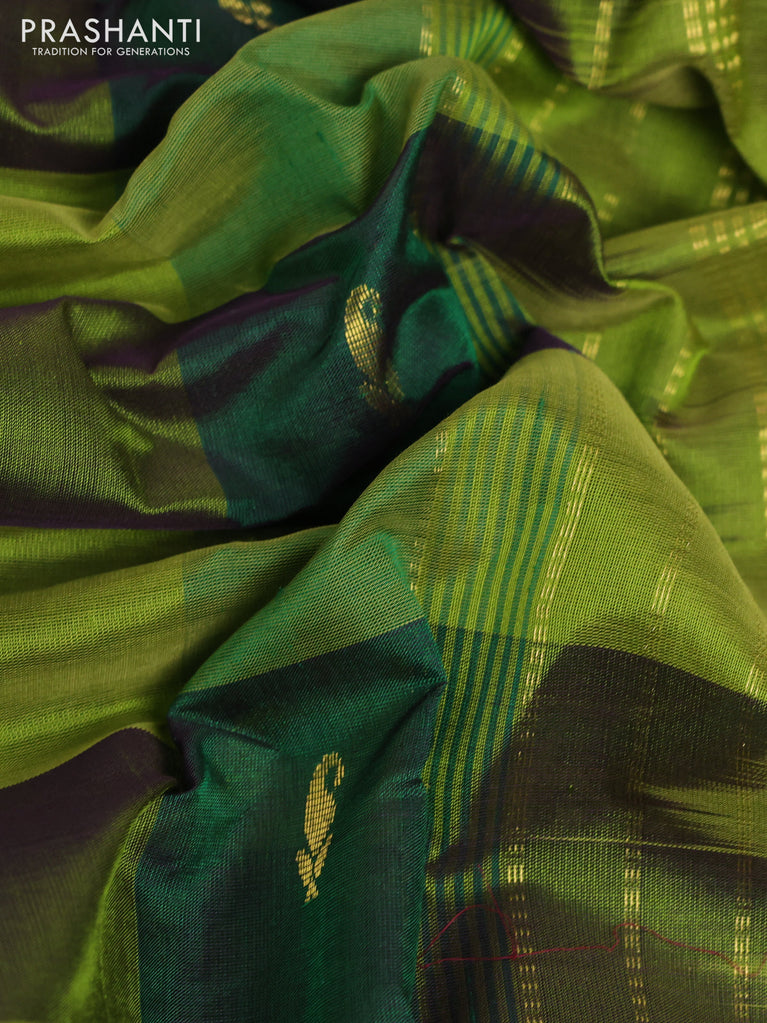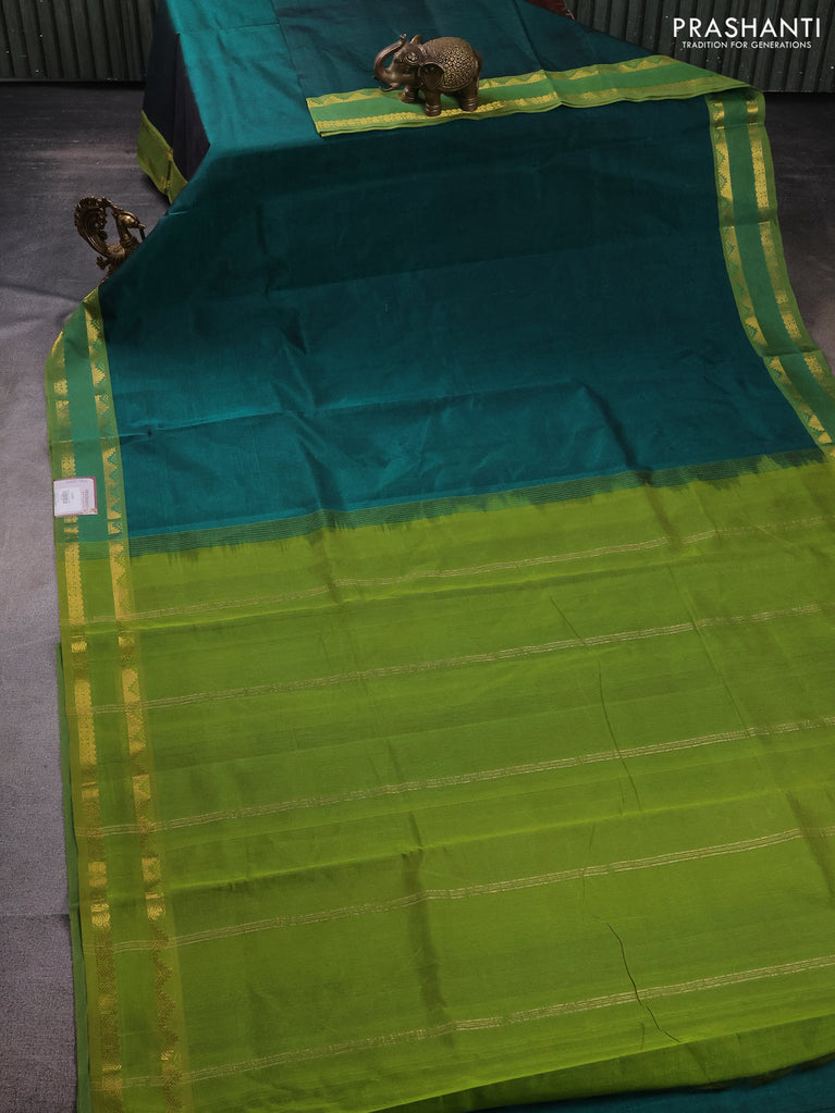 10 Yards silk cotton saree mehendi green and blue with plain body and annam zari woven border
