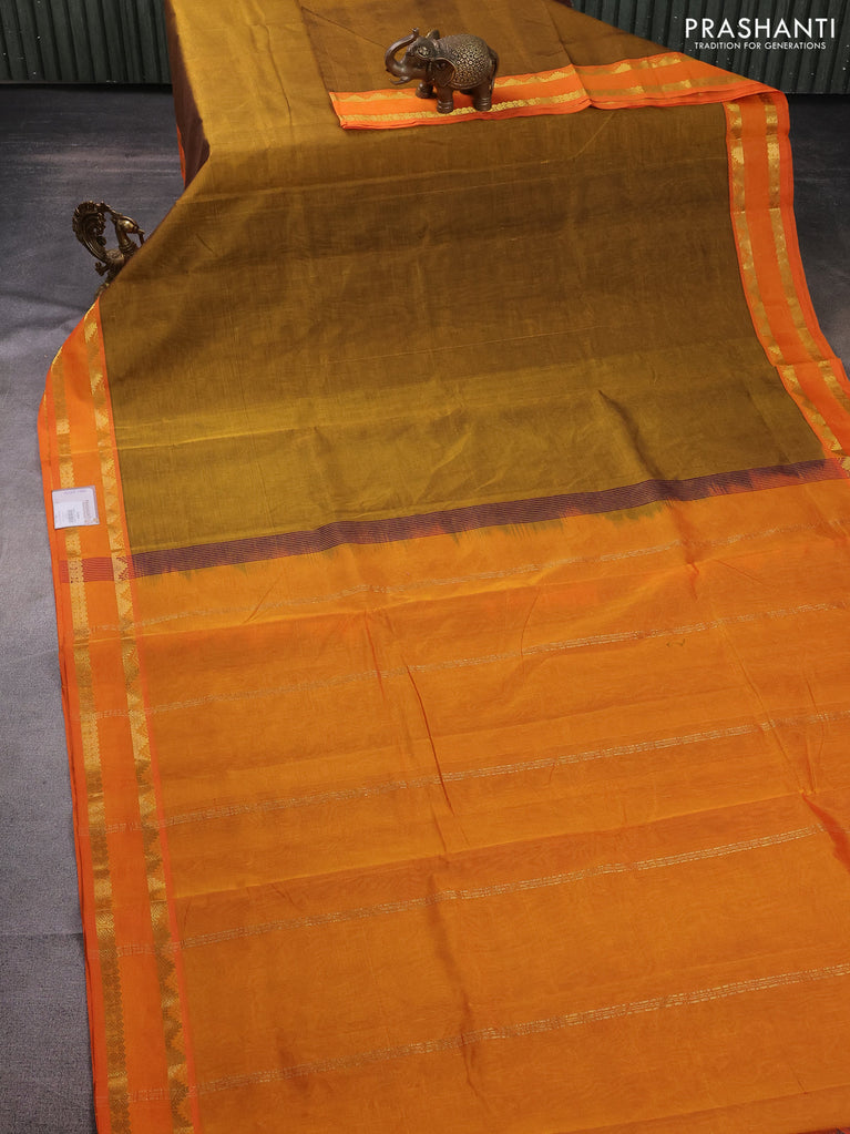 10 Yards silk cotton saree dark mustard and orange with plain body and rettapet zari woven border