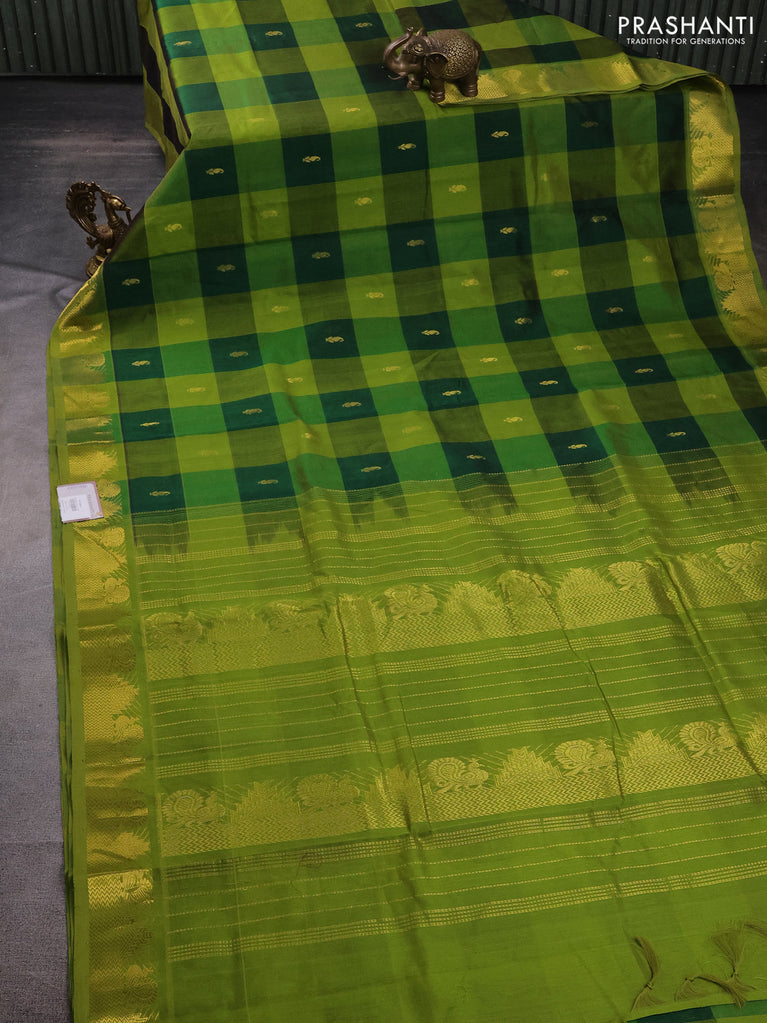 10 Yards silk cotton saree green and light green with allover paalum pazhamum checks & zari buttas and temple & annam zari woven border