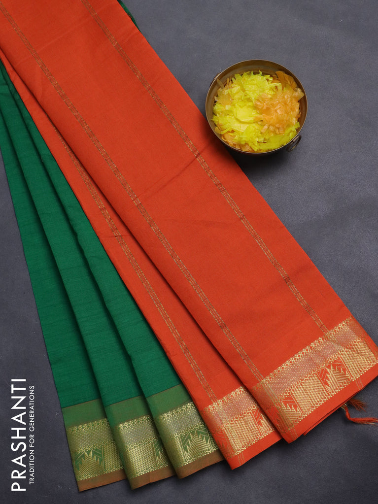 10 Yards poly cotton saree green and orange with plain body and zari woven border