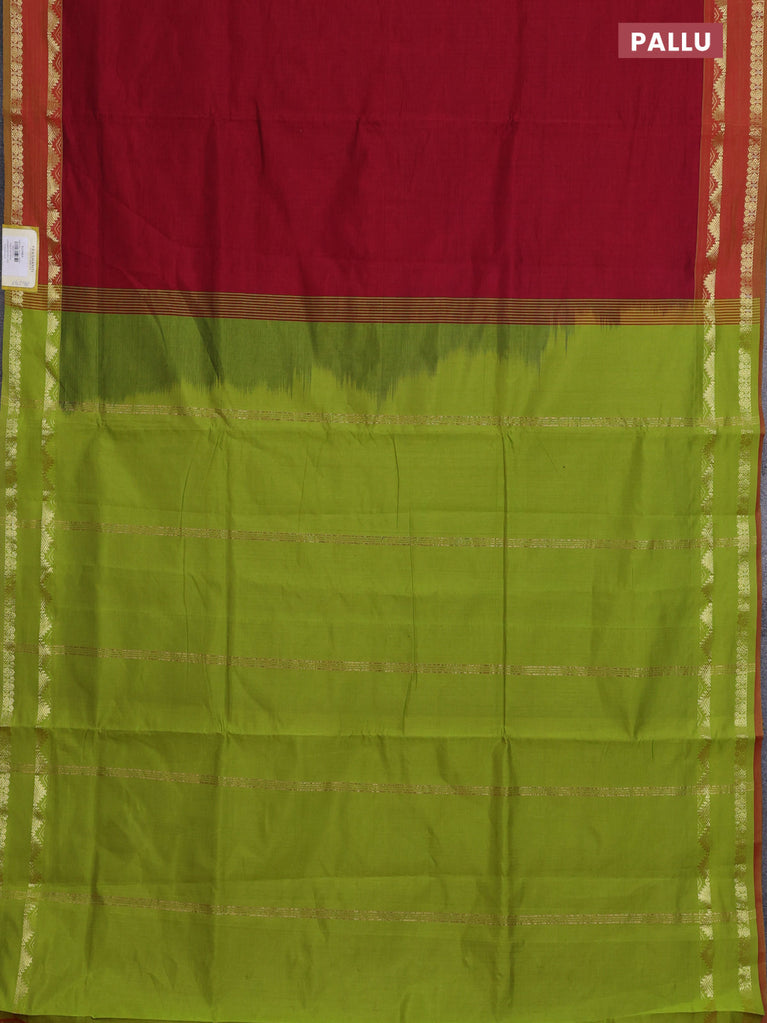 10 Yards silk cotton saree dual shade of green and red with plain body and rettapet zari woven border