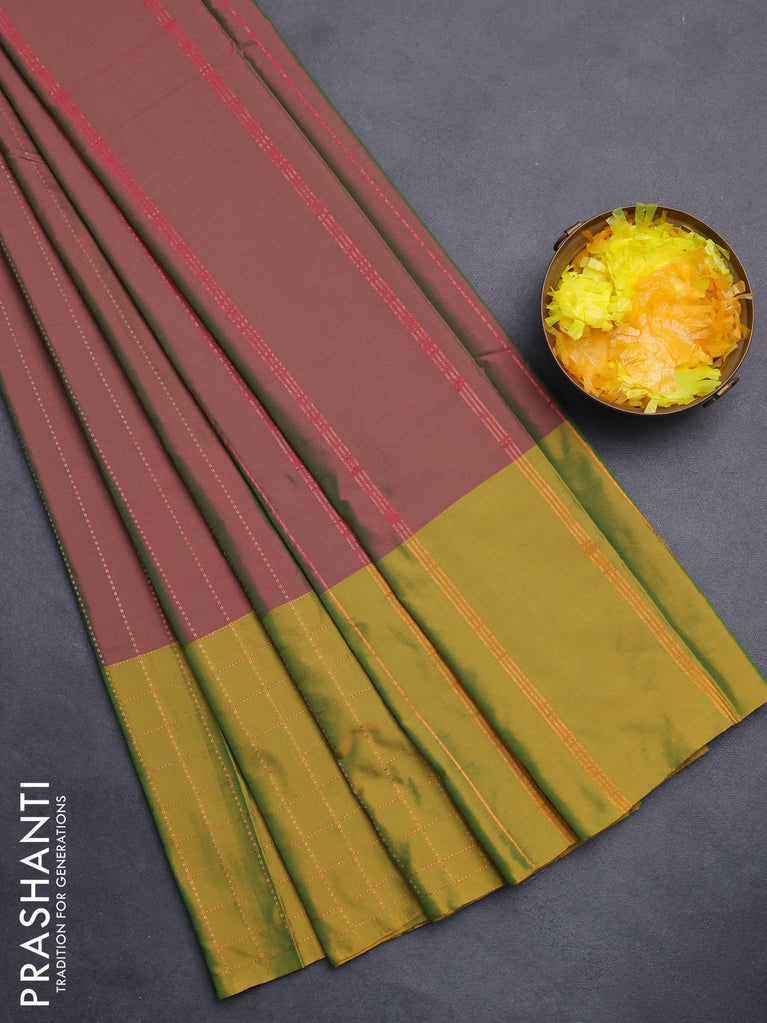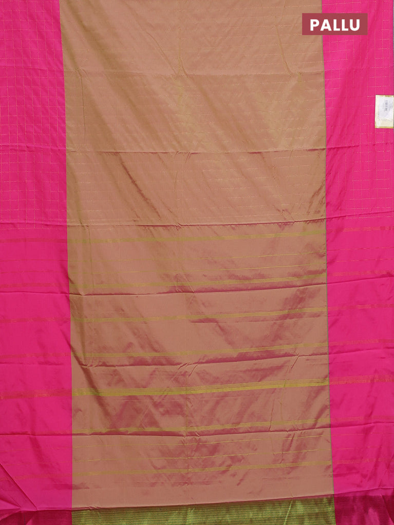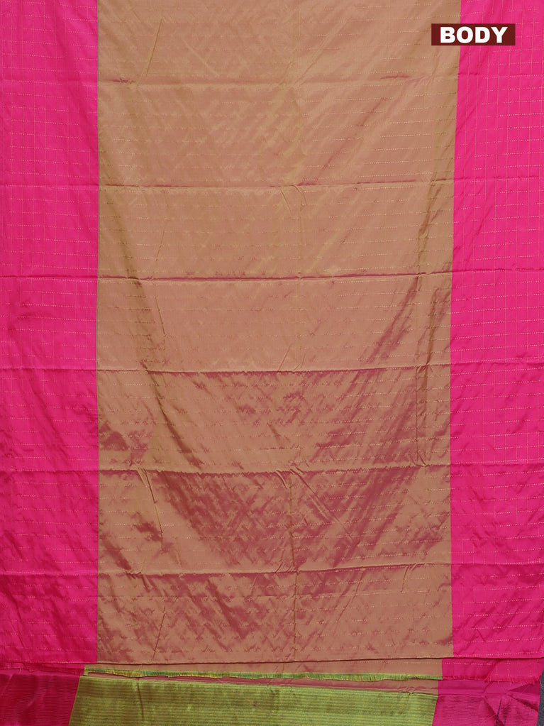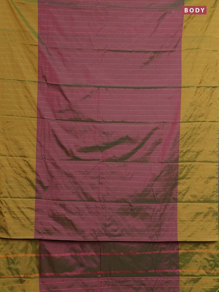 Arani semi silk saree dual shade of magenta pink and mustard green with allover copper zari weaves and zari checked border