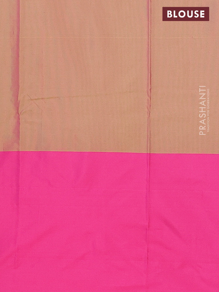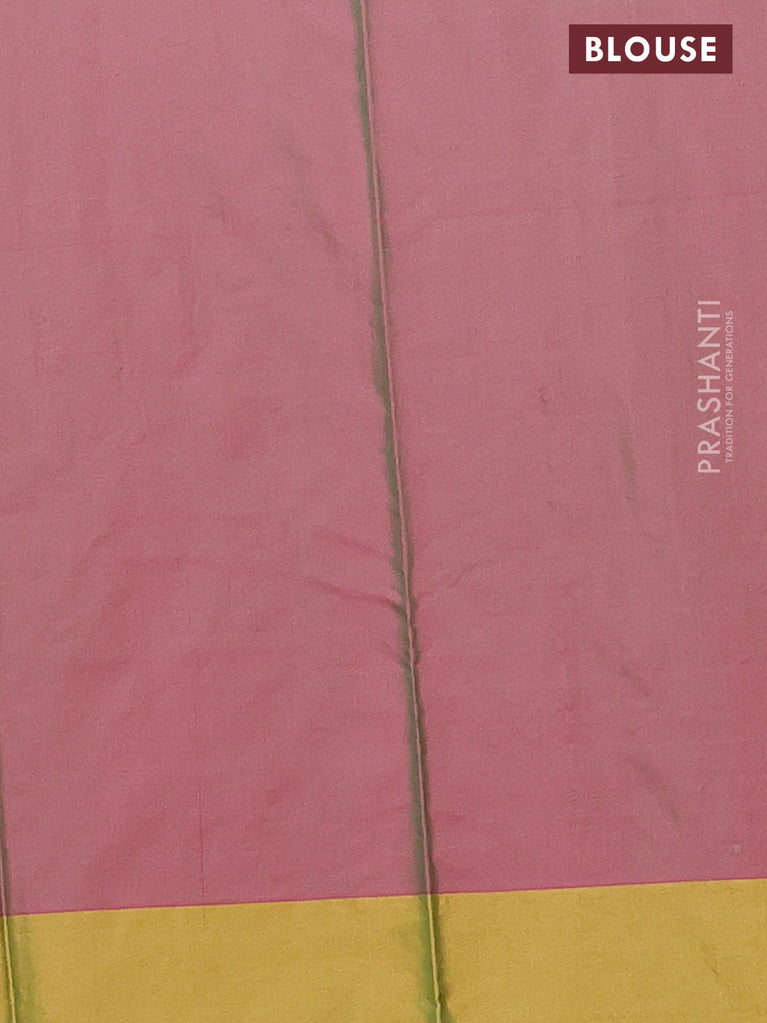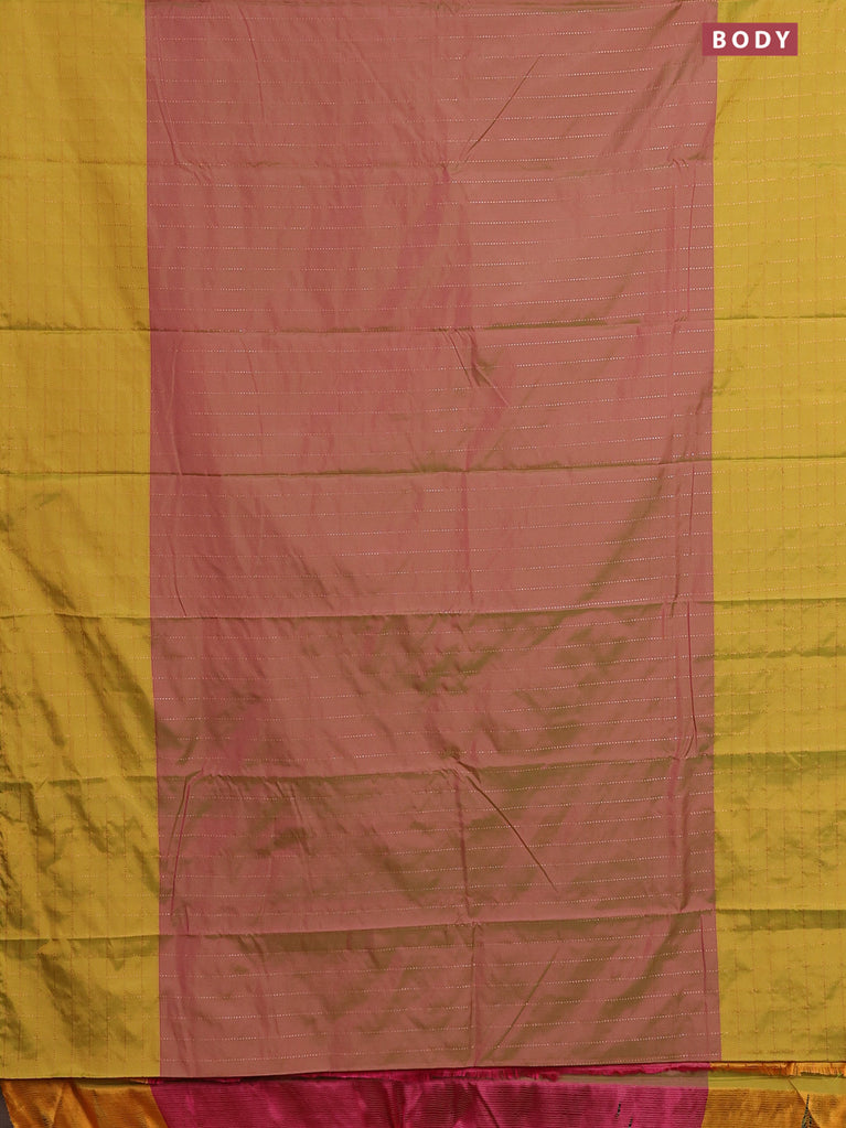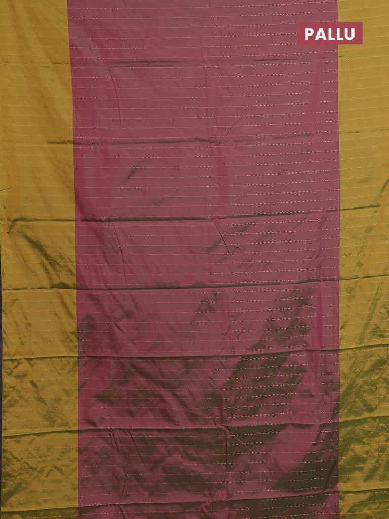 Arani semi silk saree dual shade of magenta pink and mustard green with allover copper zari weaves and zari checked border