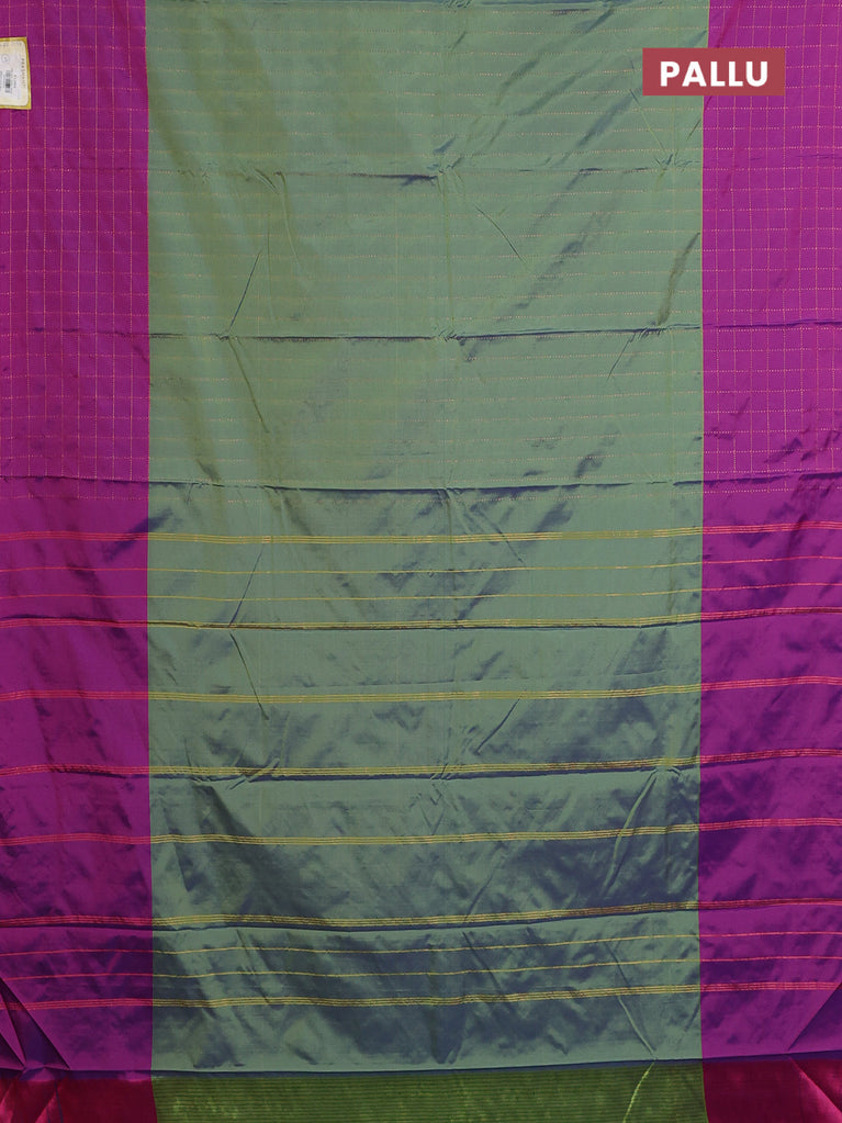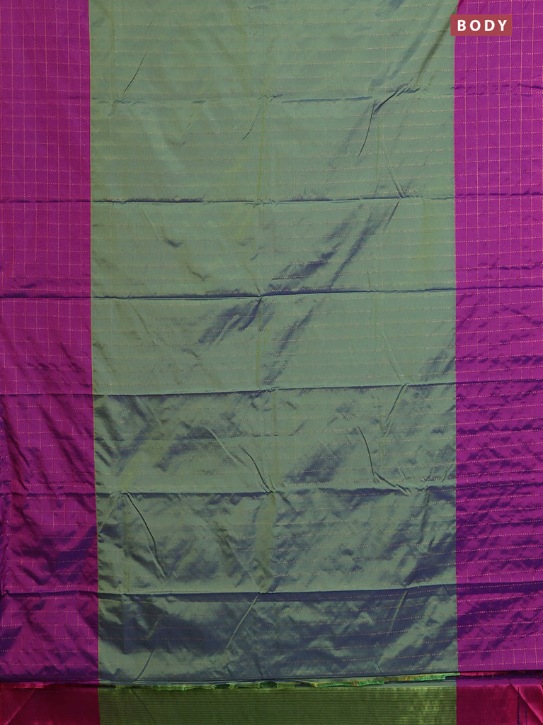 Arani semi silk saree dual shade of green and purple with allover copper zari weaves and zari checked border