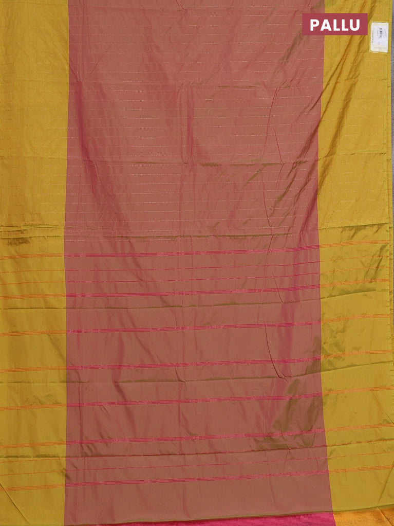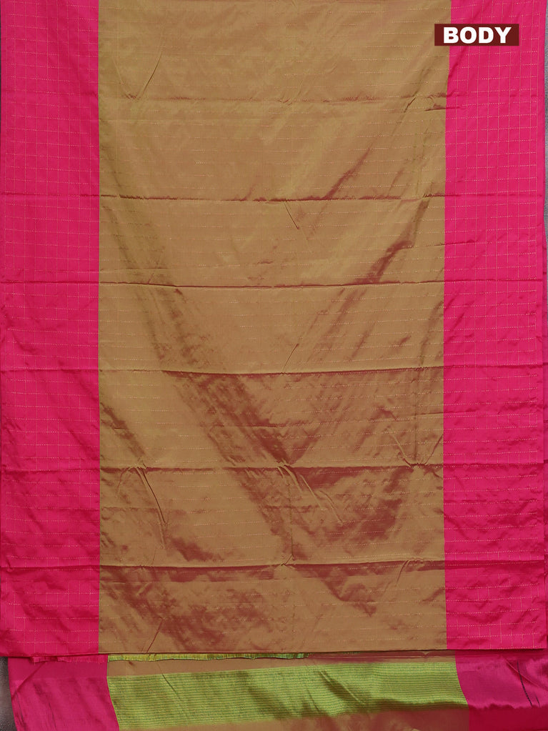 Arani semi silk saree dual shade of sap green and pink with allover copper zari weaves and zari checked border