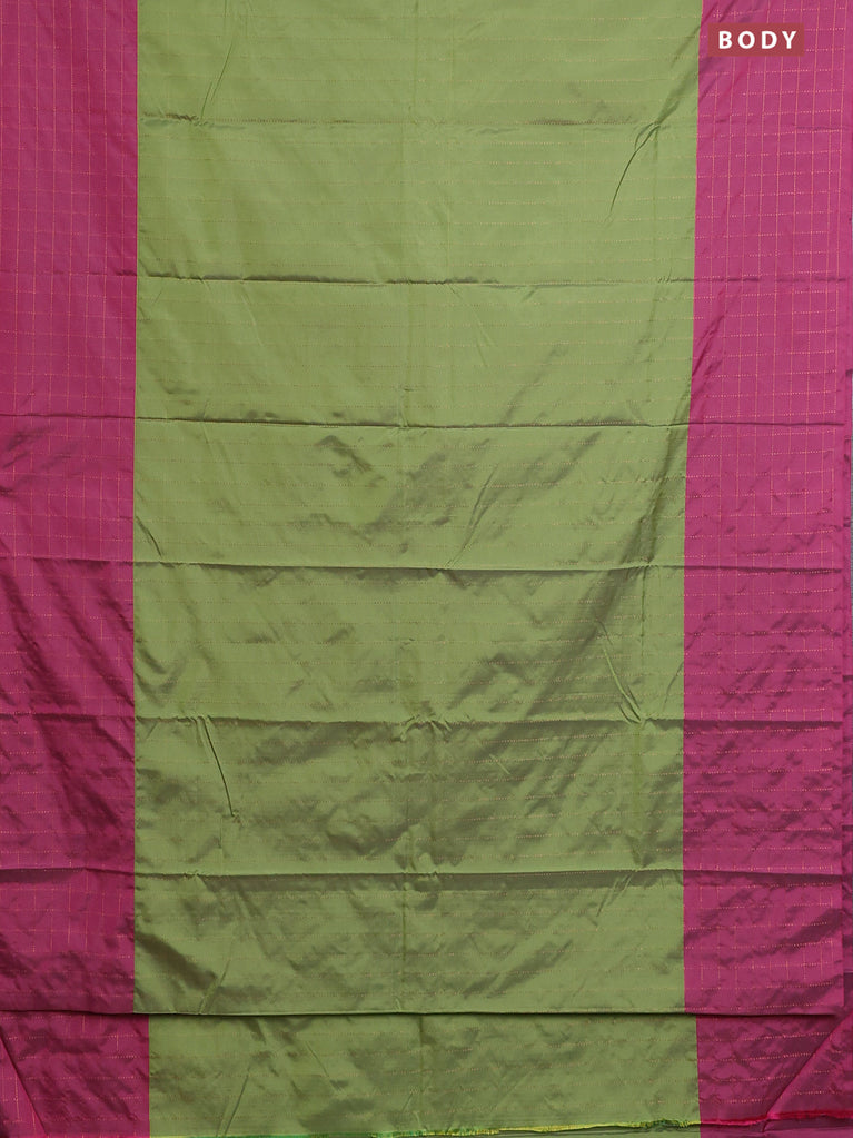 Arani semi silk saree green and dual shade of pink with allover copper zari checked pattern and copper zari woven simple border