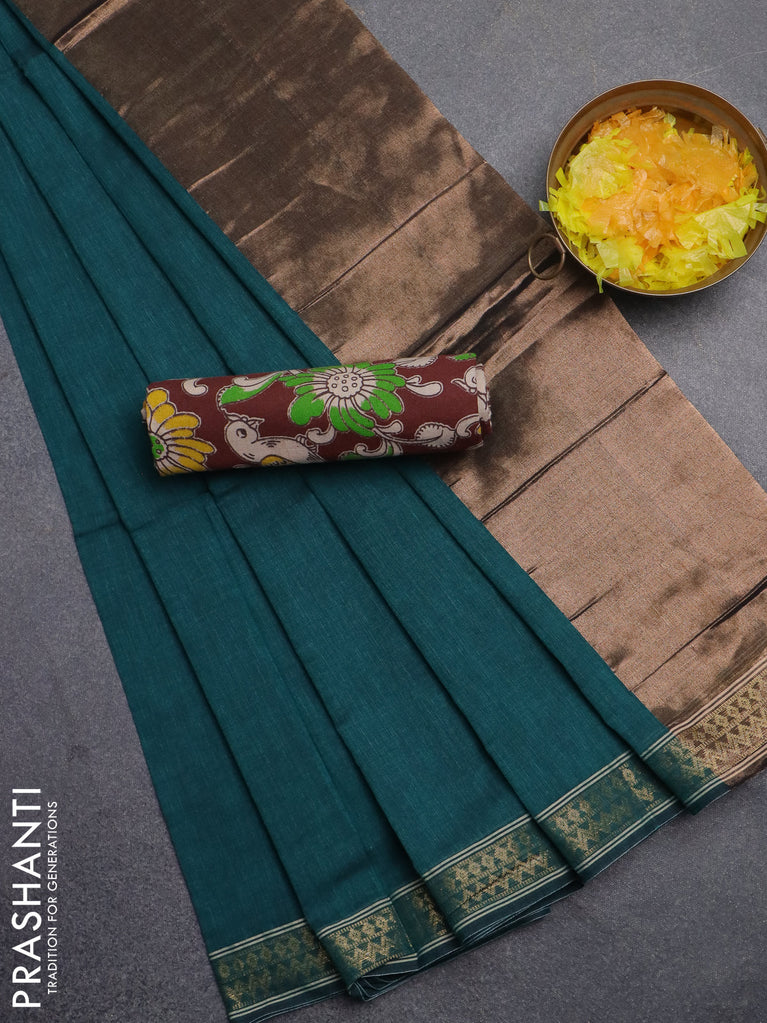 Bengal soft cotton saree teal blue shade with plain body and zari woven piping border