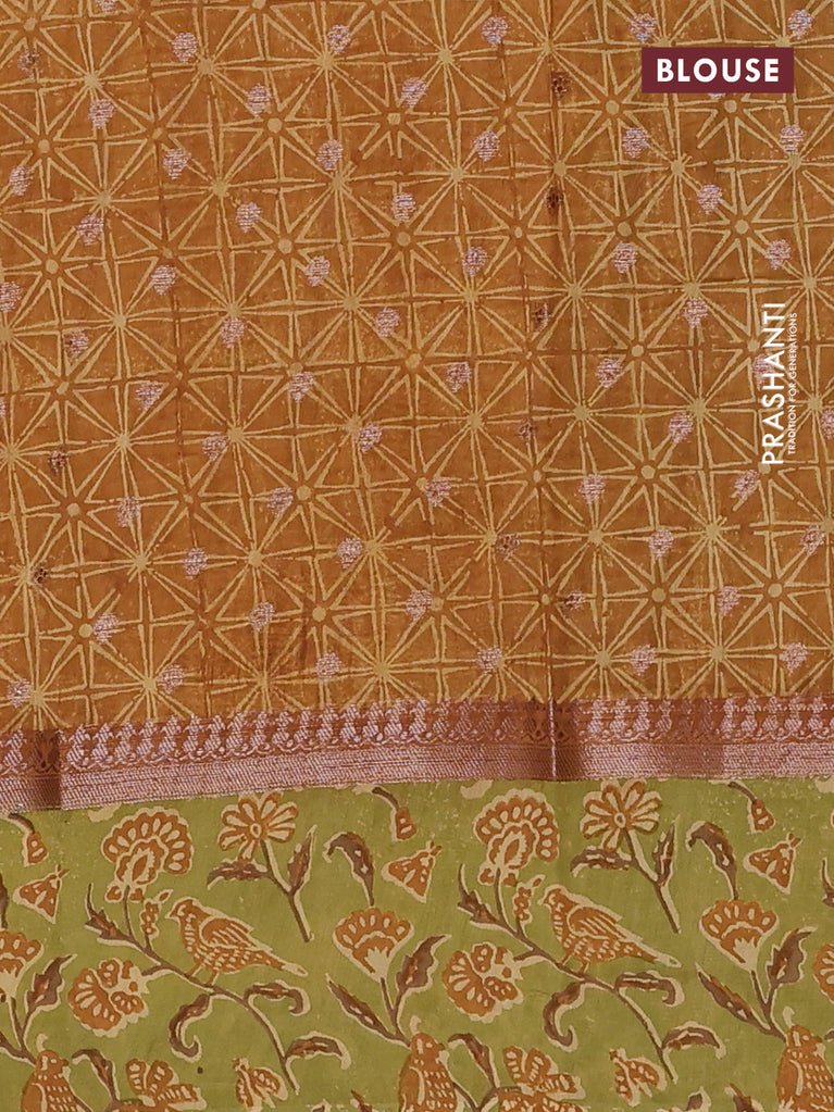 Chanderi silk cotton saree dark mustard and green with allover zari buttas and printed border