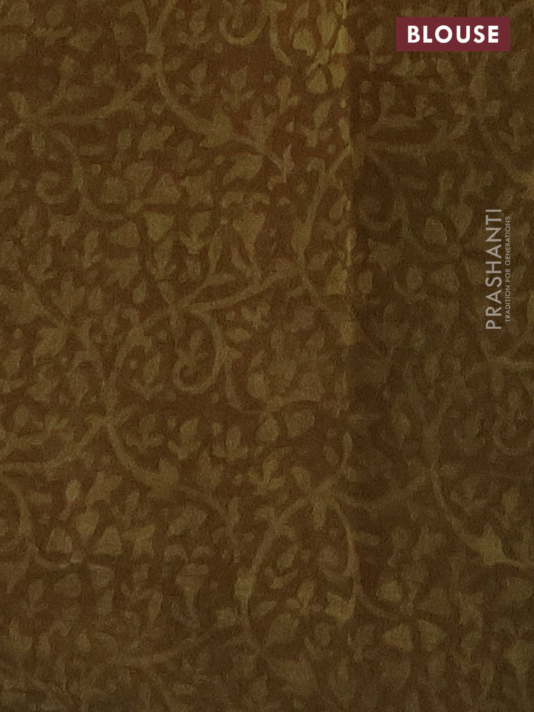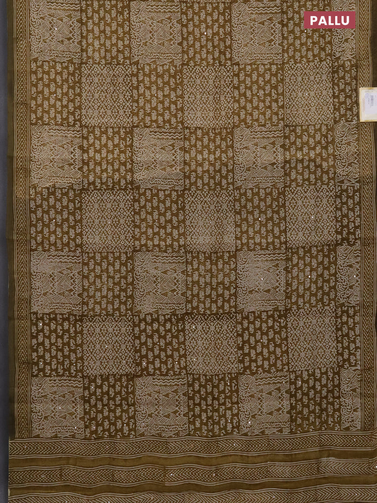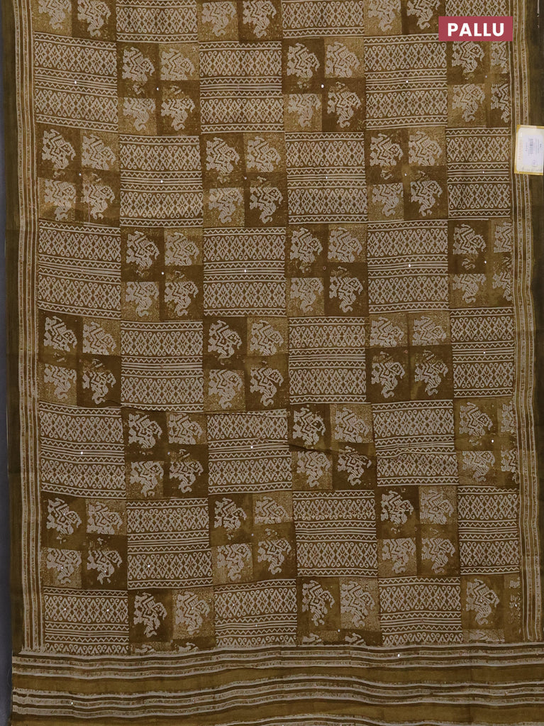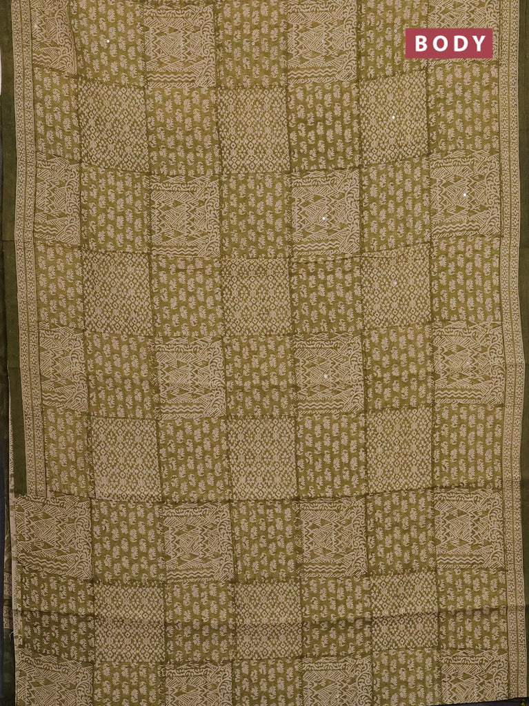 Chanderi silk cotton saree mustard green shade with allover prints & mirror work and mirror work printed border