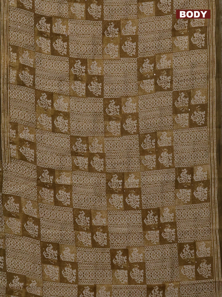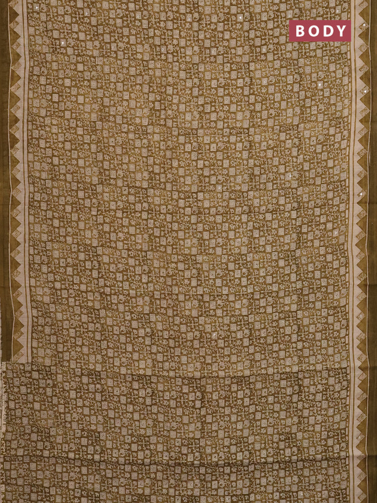 Chanderi silk cotton saree mustard green shade and beige with allover prints & mirror work and printed border