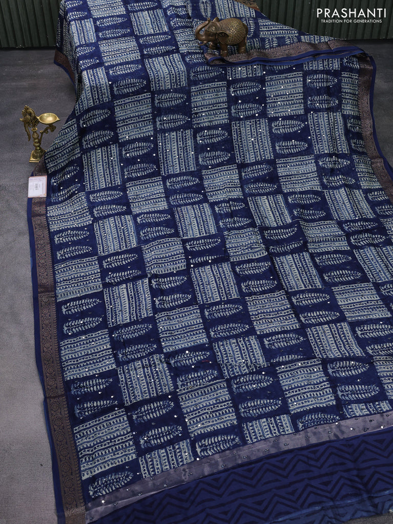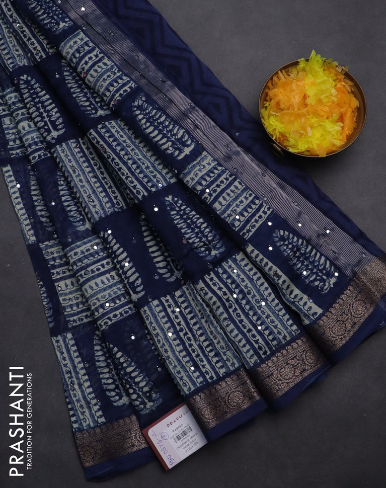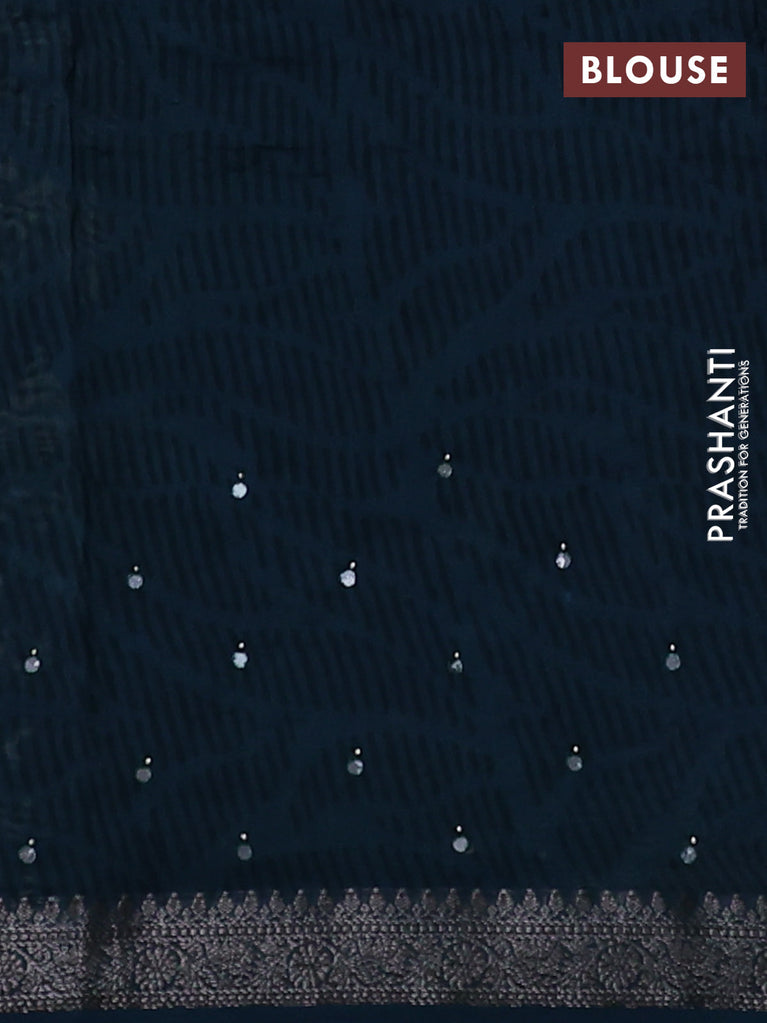 Chanderi silk cotton saree peacock blue with allover prints & mirror work and woven border
