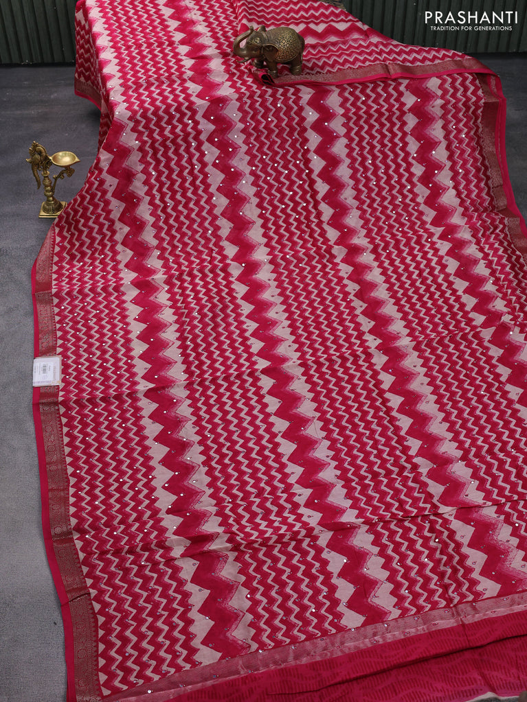 Chanderi silk cotton saree pink and beige with allover zig zag prints & mirror work and woven border