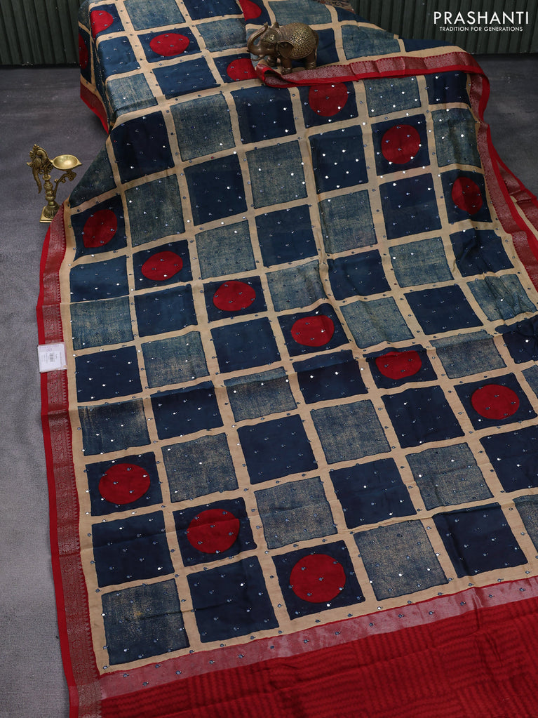 Chanderi silk cotton saree peacock blue and kumkum red with allover geometric prints & mirror work and woven border